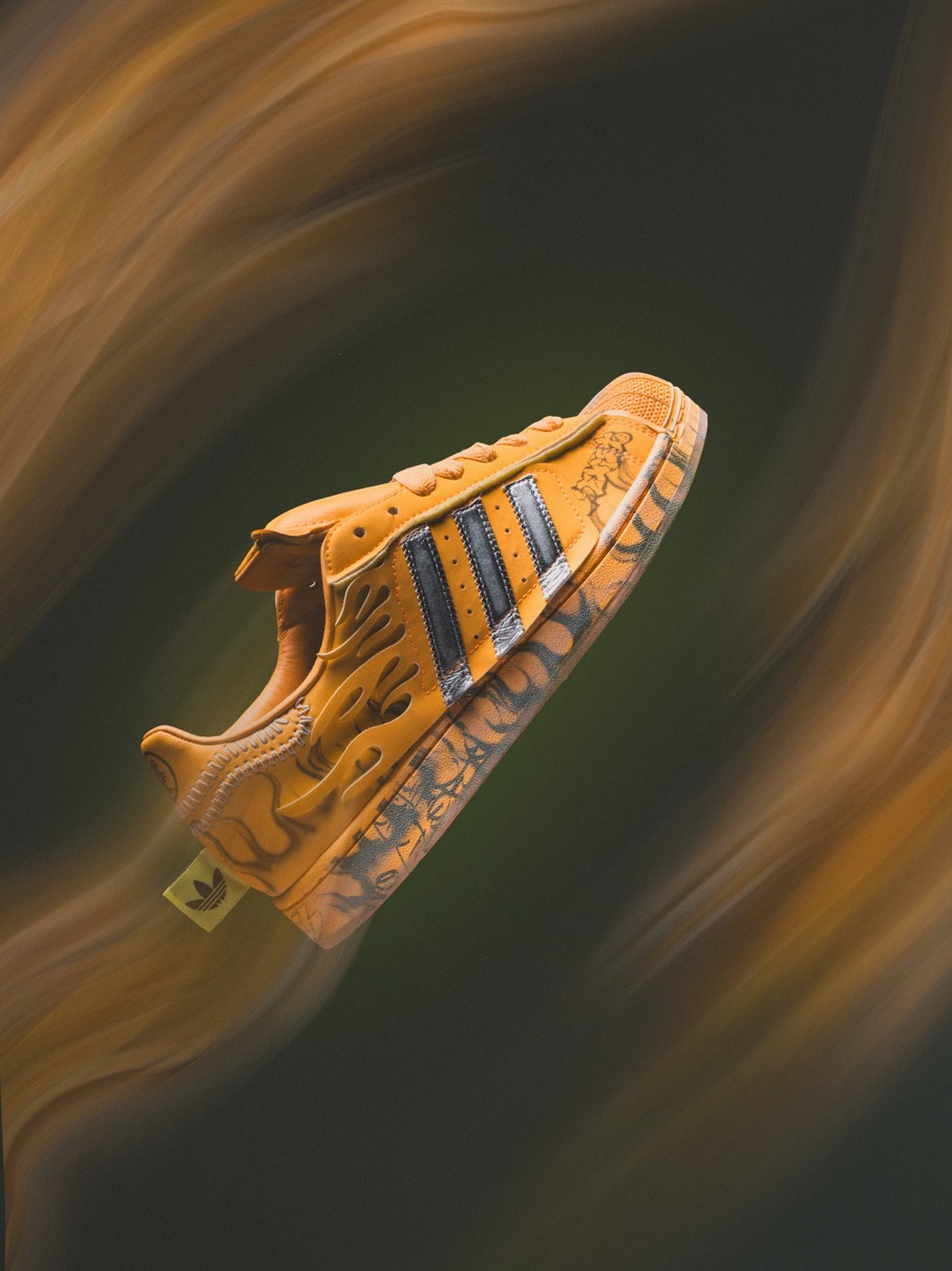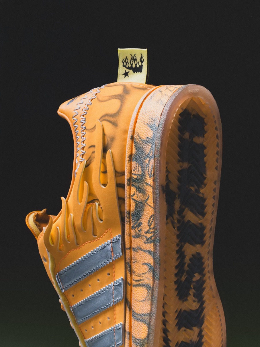 この鮮やかなヘイジーオレンジ色のスニーカーは、ヘルスターが過去に手掛けたスーパースターとのコラボレーションを特徴づけてきたデザイン要素の多くを継承している。サイドにはシルバーのグラフィティ風のアートワークが施され、シューズ内側やインソールにはブランドを象徴する“叫ぶ顔”のグラフィックが反骨精神あふれるビジュアルのインパクトを加えている。タン部分にはヘルスターのロゴが配置され、アディダスのコラボレーションラインナップにおける同ブランドの存在感をさらに強めている。