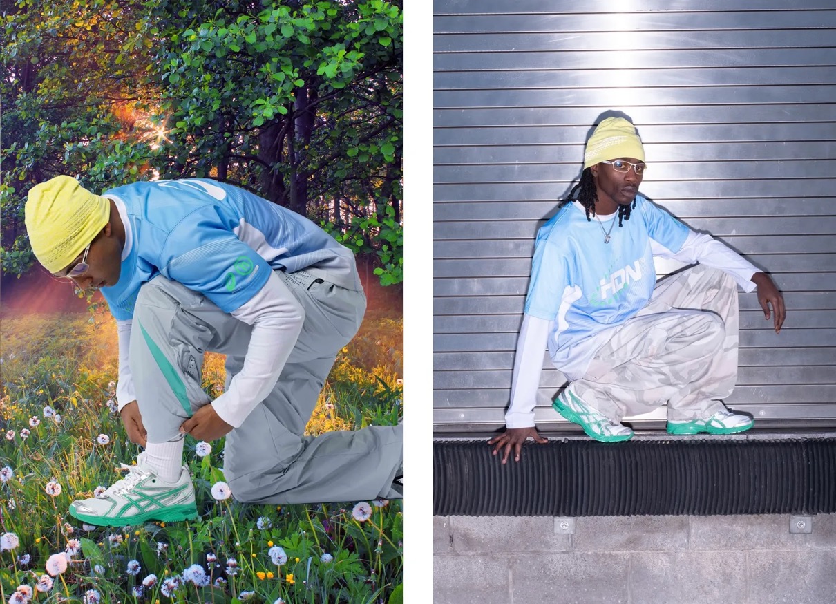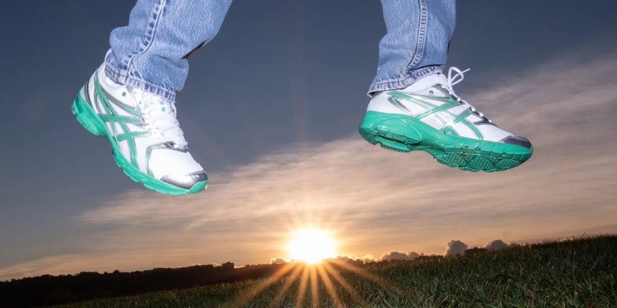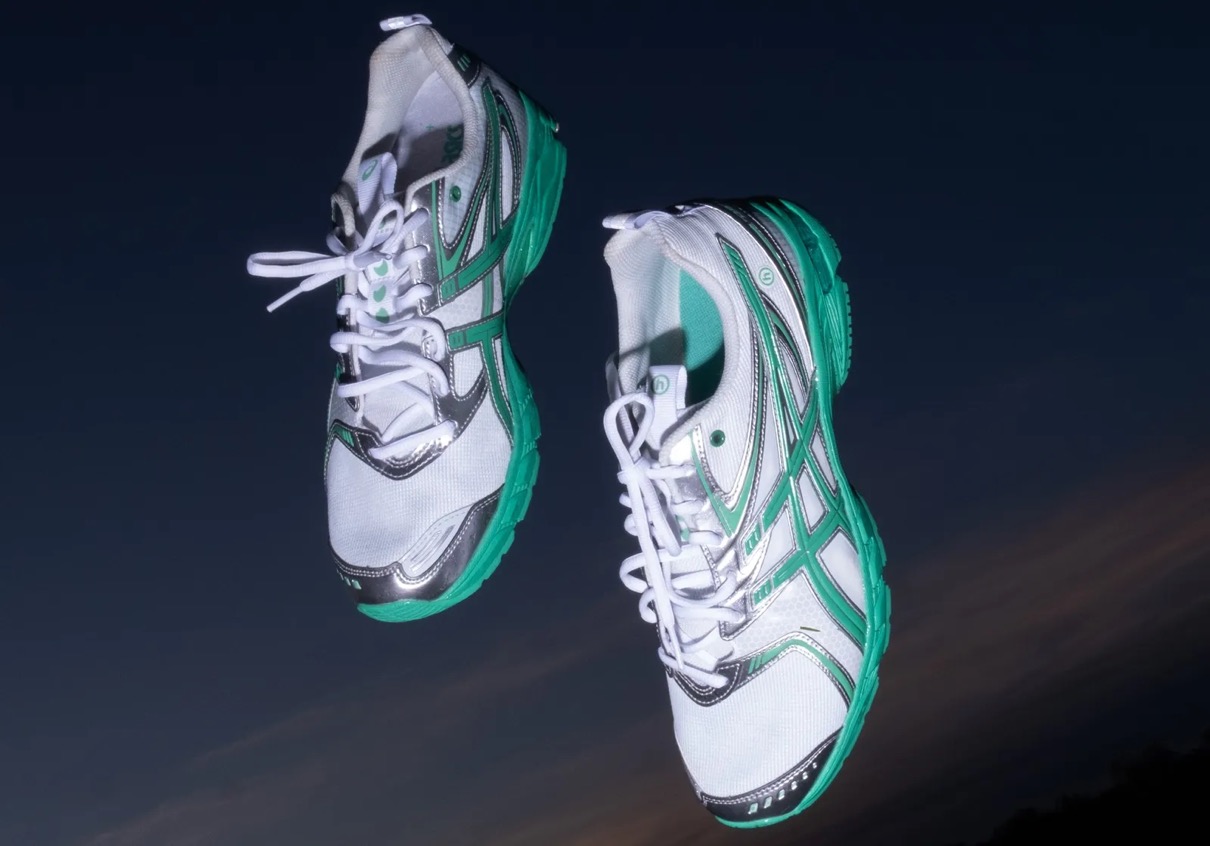 今回のコラボでベースとなるアシックスのハイスペックトレーニングシューズ『GEL-DS TRAINER 14(ゲルDS トレイナー14)』は、2000年代後半に見られたデザイン要素を現代のライフスタイルシーンにおける快適性と汎用性を調和したモデルとして復刻したシューズ。特徴的なアッパーには、アイコニックなクォーターパネルデザインとオープンメッシュパネルを採用。このディテールは当時のランニングシューズのデザインに見られるダイナミックさと美しさを演出する要素となっており、ソールシェイプはナローな構造ながら快適なクッショニング性能を備え、TRUSSTICユニットが安定性を生み出し、かかと部のGELテクノロジーが衝撃緩衝性を高めてくれる。