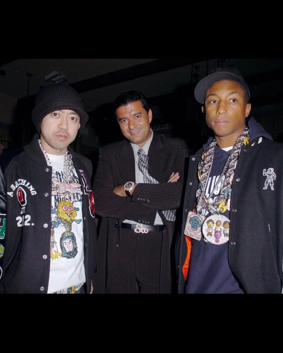 2000年代初頭、NIGO®︎はジェイコブ・アラボにカスタムジュエリーの制作を依頼していた。両者の創造性と感性に強い共鳴を見出したジェイコブは、ファレル・ウィリアムスとNIGO®︎を引き合わせる。この出会いは、後にファッション、音楽、そしてラグジュアリーの領域において、世界的な文化的影響をもたらす創造的パートナーシップの出発点となった。その後、ファレル・ウィリアムスとNIGO®︎は、Billionaire Boys ClubおよびIce Creamの設立、A BATHING APE®︎(BAPE)の国際的展開、そして数々のクリエイティブプロジェクトを通じて、ストリートウェアとラグジュアリーの関係性を再定義し、現代のカルチャーに多大な影響を与えてきた。また、ジェイコブ・アラボとファレル・ウィリアムスは30年以上にわたり、100点を超えるカスタムジュエリーを共同制作。革新性、共通する感性、そして最高峰のクラフツマンシップへの敬意に基づき、新たなジュエリー表現を切り拓いてきた両者の創造的パートナーシップは、ジェイコブ&コーの歴史において重要な位置を占めている。