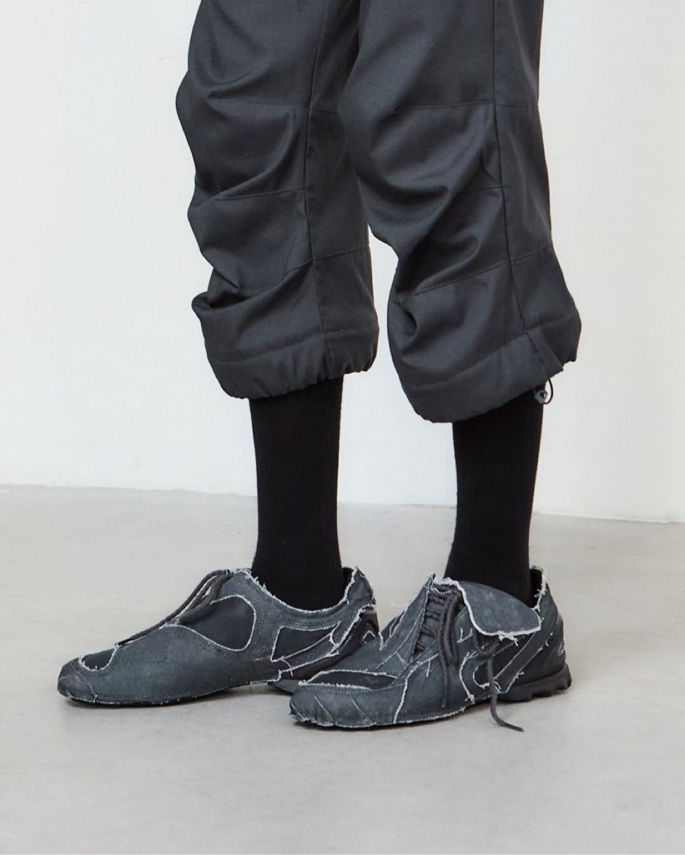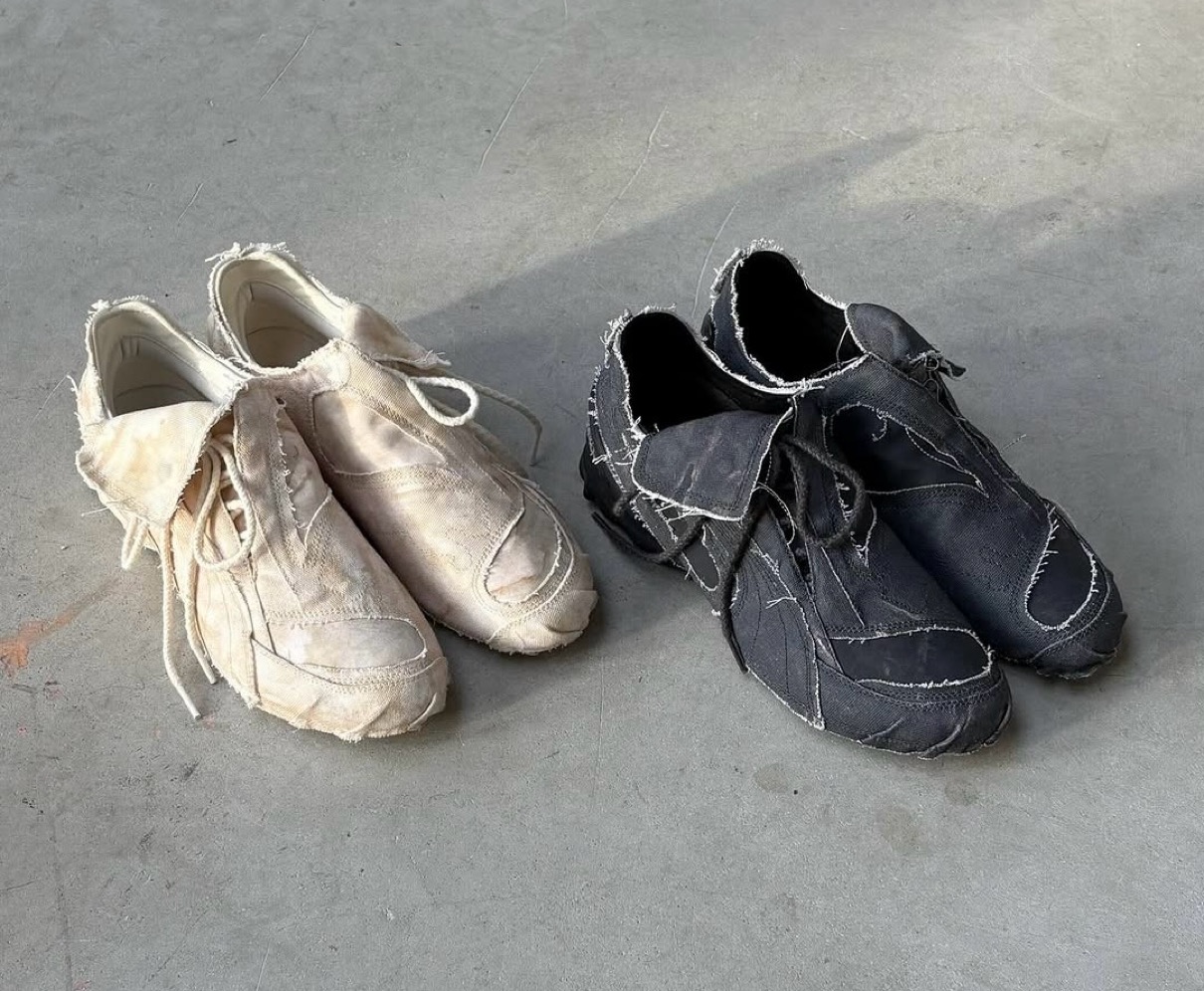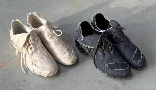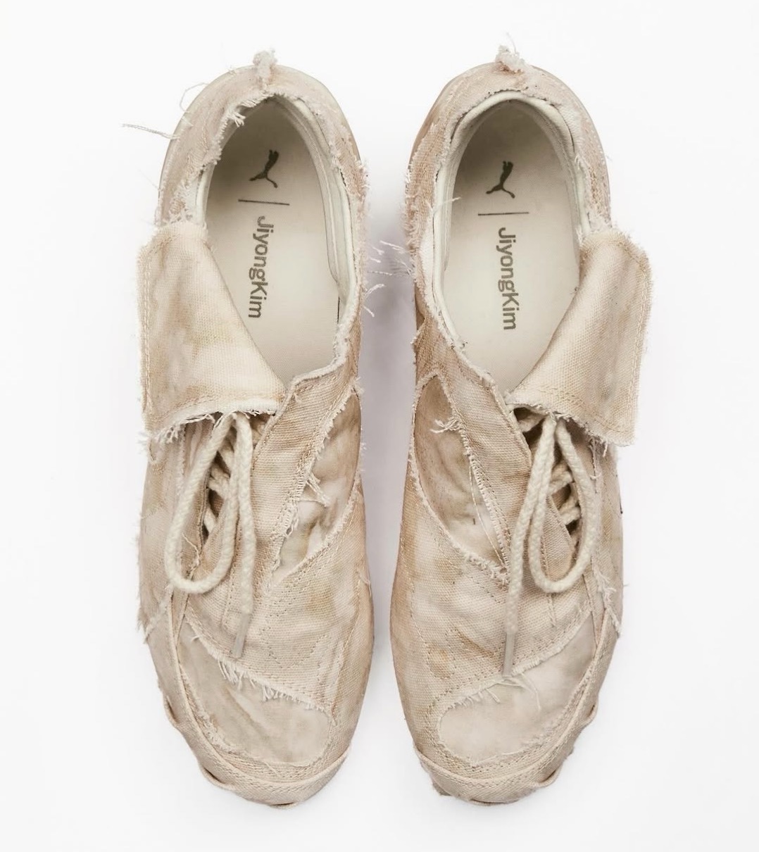 JiyongKim × PUMA V-S1シルエットは、パフォーマンスシルエットを職人技的な手法で再構築。手作業によるプロセスでミニマルに削ぎ落とされ、日焼け加工を施したファブリックアッパーが各ペアに独特の風合いを与える。ほつれた縁と露出したステッチが意図的に未完成な美学を強調し、クォーターパネルとトゥボックスに施されたパッチワーク風の構造が、触感と経年変化を思わせる効果を生み出し、同系色のシューレースとインソールに配置された共同ブランドロゴが調和する。