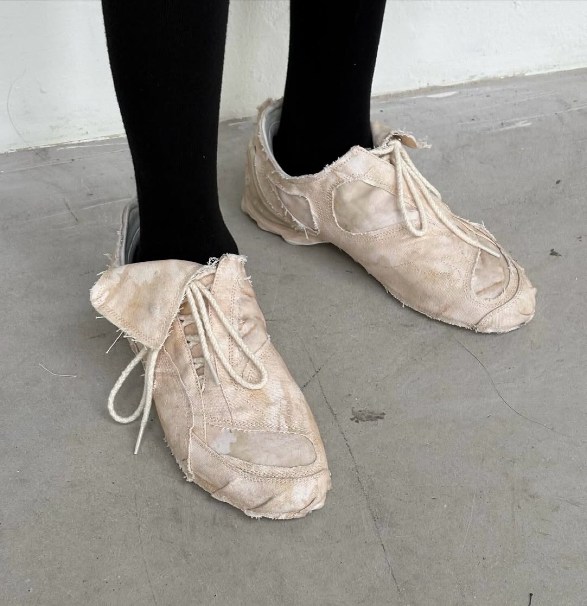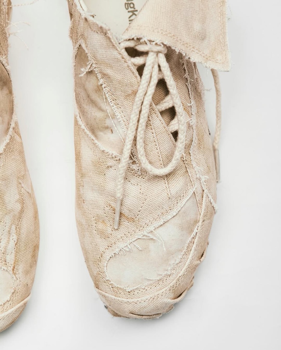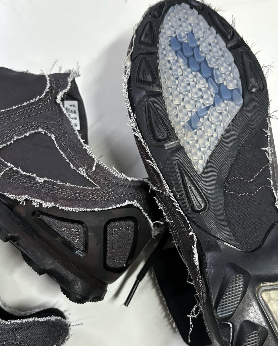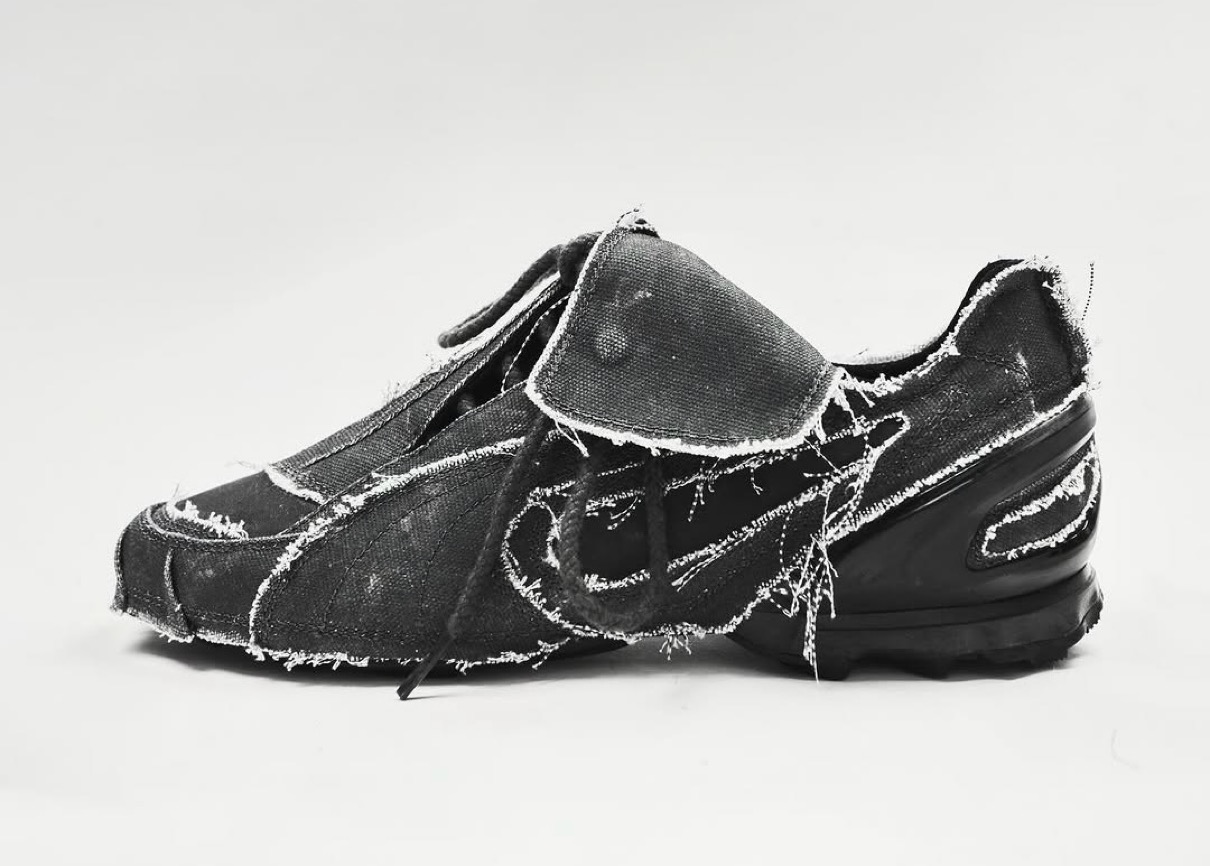 JiyongKim × PUMA V-S1シルエットは、パフォーマンスシルエットを職人技的な手法で再構築。手作業によるプロセスでミニマルに削ぎ落とされ、日焼け加工を施したファブリックアッパーが各ペアに独特の風合いを与える。ほつれた縁と露出したステッチが意図的に未完成な美学を強調し、クォーターパネルとトゥボックスに施されたパッチワーク風の構造が、触感と経年変化を思わせる効果を生み出し、同系色のシューレースとインソールに配置された共同ブランドロゴが調和する。