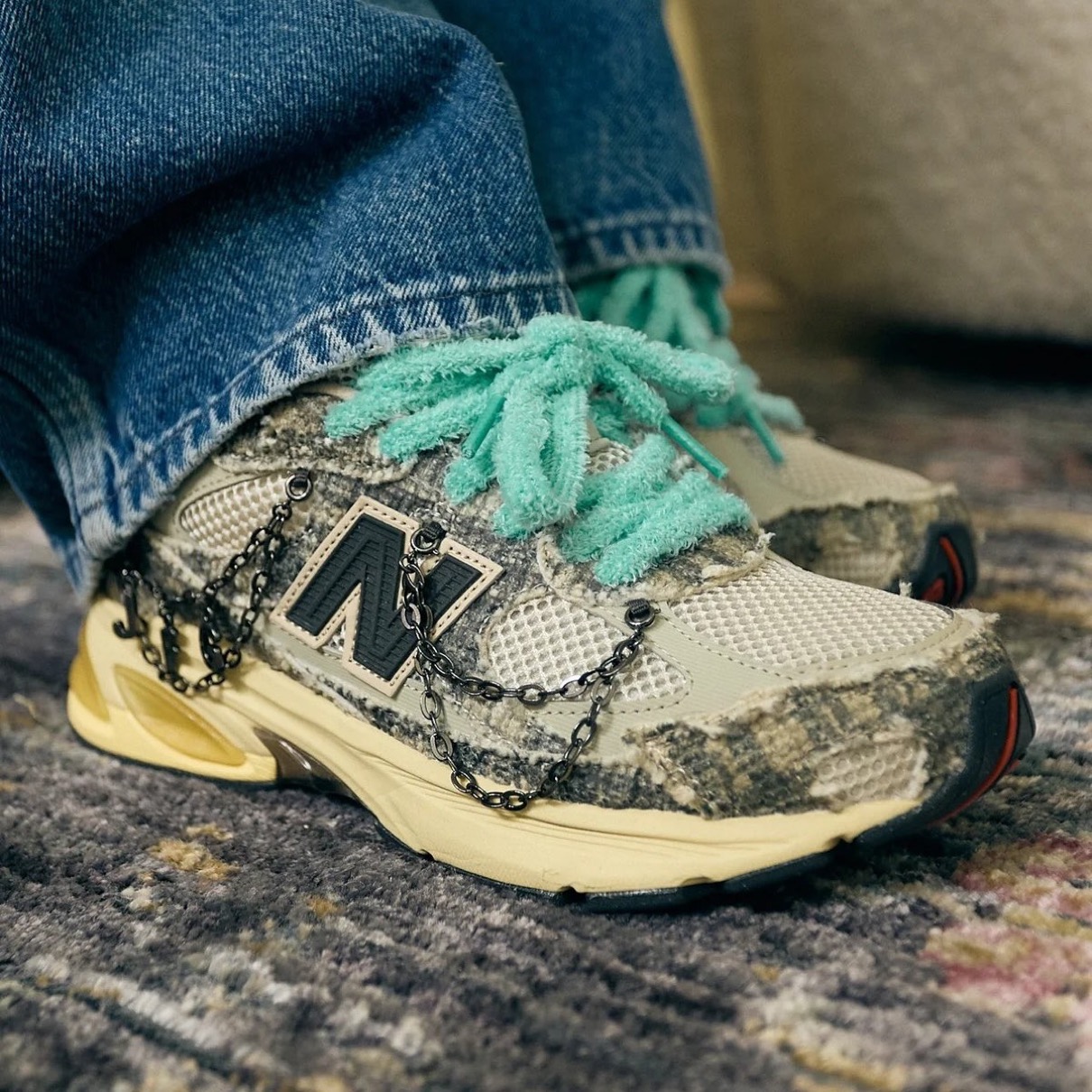 今作では“ハンド・ミー・ダウンズ”と“バッグ・レディ”の2カラーがラインナップ。両モデルとも、柔らかなロングパイルのフェイクファー製シューレースが付属し、カスタマイズ可能な取り外し式「JFG」チェーンを装備。アッパーにはウール調のラギッドなオーバーレイを配置し、ジョー・フレッシュグッズの機能美と物語性のあるデザインを象徴している。シルエットは成長、成熟、そして静かに内包しながらも力強く発する自信を物語っている。今作はニューバランスとの11作目のコラボリリースにあたり、この旅路がJFGチームをどこまで導いてくれたかを振り返りたいと考えているという。