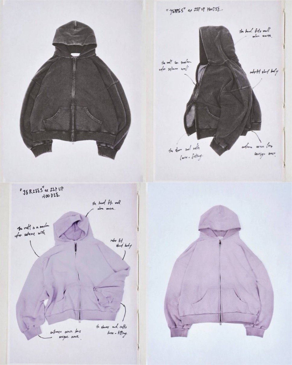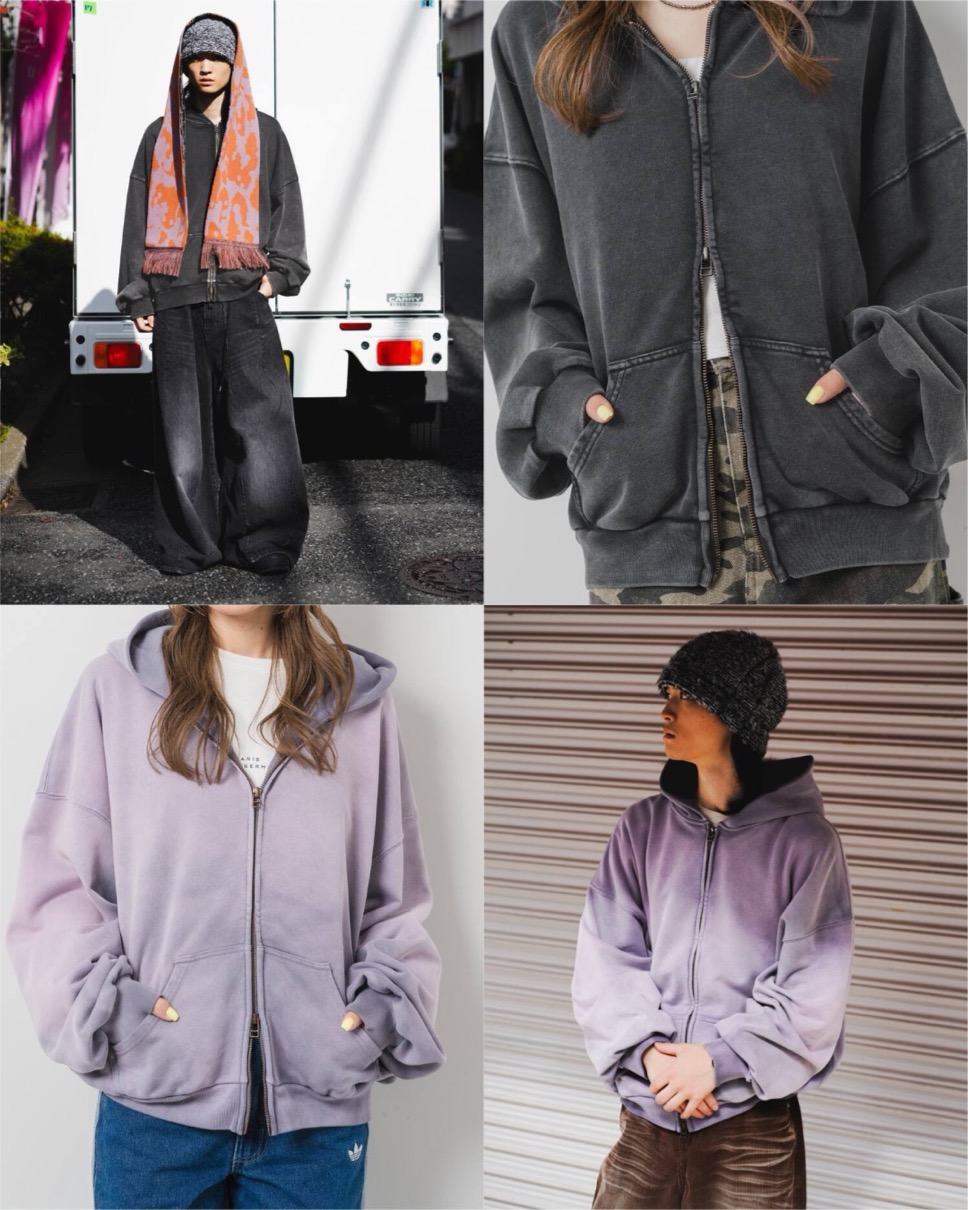 洗練された雰囲気の特殊な生地加工を用いた高級感のある退色は、現在市場にあふれたヴィンテージ、日焼け加工とは一線を画す。無数の生地から本加工感と相性が良いものをピックアップすることで奥行きのあるブラックとパープル、モダンな2色に仕上がっている。特徴的なフードは立体感をキープしつつ、ハイブランドを中心に盛り上がりを見せるコンパクトフードを採用。フロントポケットもフード同様に、盛り上がりを見せるコンパクト仕様に。独特のカーブを描くスタイルはデザイン性も抜群、ZIP部分はダブルアップを採用し、インナー使い含めて様々なスタイリングを楽しめる。