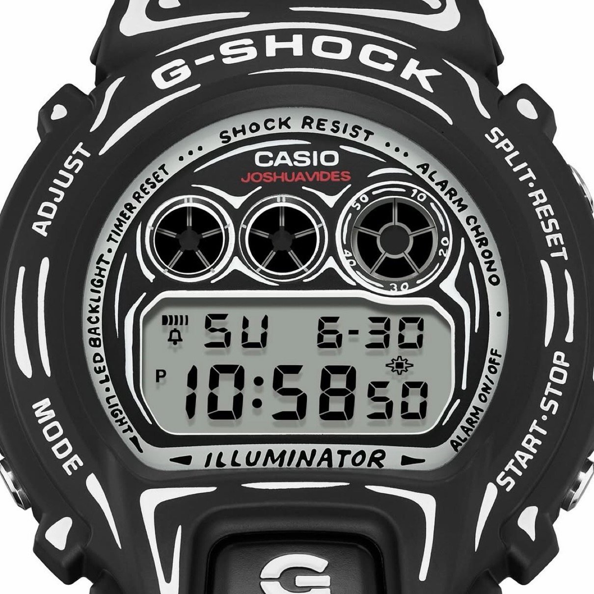 1983年の誕生以来、様々なカルチャーと融合し進化を続けるG-SHOCKから、Joshua Vides(ジョシュア・ヴィーダス)とのコラボレーションモデルが登場。 フロントボタンと三つ目液晶が特徴の「DW-6900」は、Joshua Videsならではのモノトーンを基調としたコミックタッチのグラフィックをフェイス部からベゼル、バンドまで時計全体に配した。 ブラックベースにホワイトのグラフィックを施し、マット仕上げでシャープな表情に。Joshuaの手描き風フェイスデザインが特徴で、バックライト点灯時には彼のトレードマークの「Cone」が浮かび上がる。特製パッケージ付きのスペシャルモデルだ。