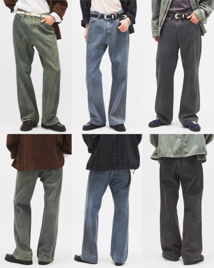 今回登場するHAZY MIST HEM CUT DENIMは、コンパクトな腰まわりと、膝下から広がる構築的なライン。リラックス感がありながらもシャープさを残した、新感覚のワイドシルエット。霧がかかったように全体をフェードさせた“HAZY MIST”加工により、曖昧で繊細なトーンを表現。クリーンさとヴィンテージ感が同居する表情に仕上げている。カラーはブラック、ネイビー、ブルーの三色展開。