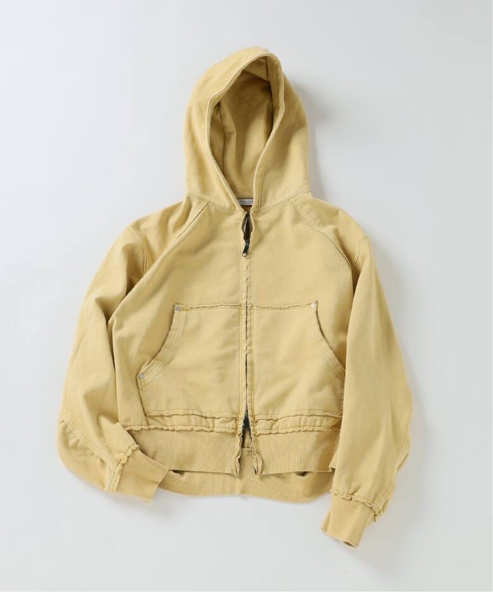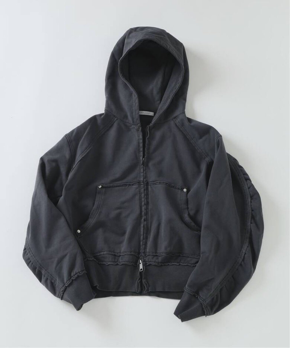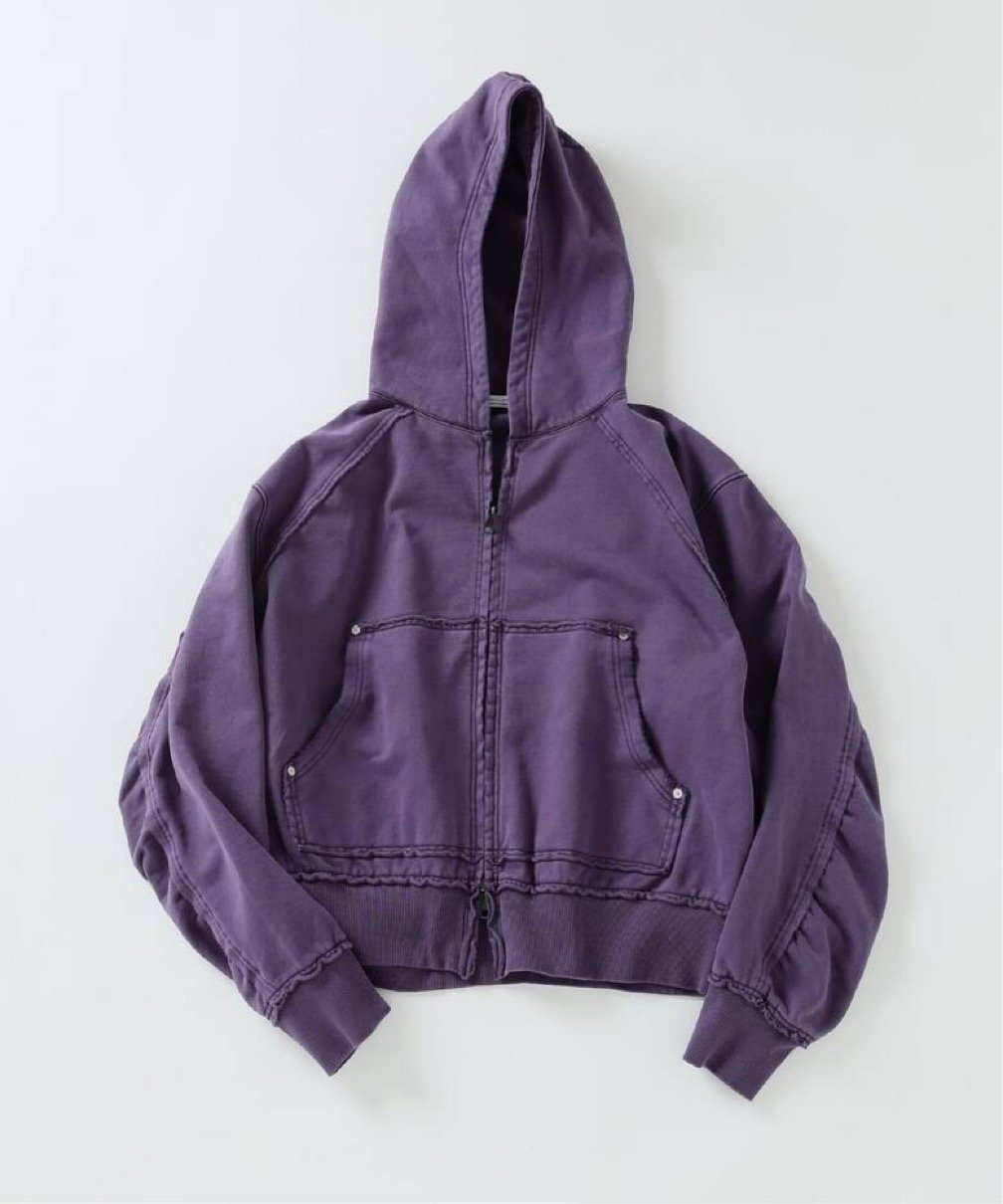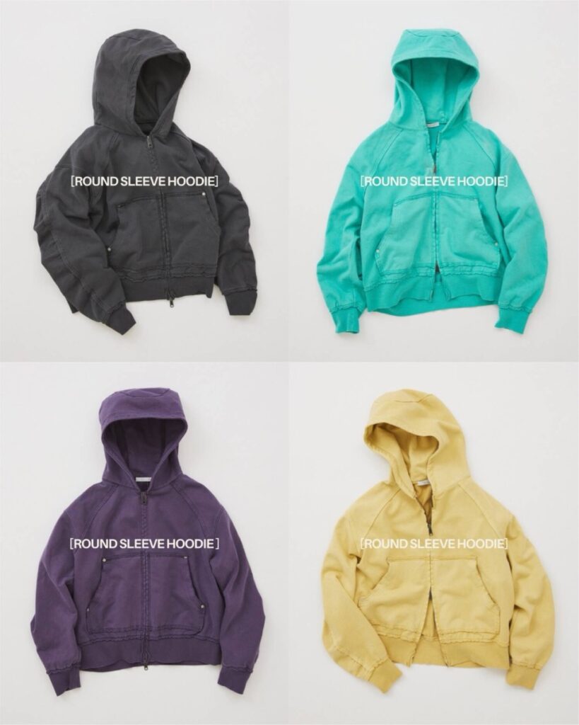 ROUND SLEEVE HOODIEは、ヘビーオンス裏毛を使用したZIPパーカ。ミリタリージャケットを思わせるフォルムをベースに、袖を前振りにすることでブルゾンのような立体的なシルエットを実現。ギャザーを入れたカーブラインが動きのある表情を生み出し、存在感のある一着に仕上げている。強めの洗いによるフェードカラーが特徴で、ヴィンテージライクな風合いが魅力。今季は肩線を斜めに切り替え、断ち切り仕様をより際立たせたデザインにアップデート。フロントやポケット周りにも断ち切りディテールを加え、統一感のあるラフなムードをプラスしている。ポップな色味を取り入れたカラー展開もポイントで、スタイリングに軽快さと新鮮さを加えてくれる一枚。カラーはブラック、ブルー、パープル、マスタードの4色展開。