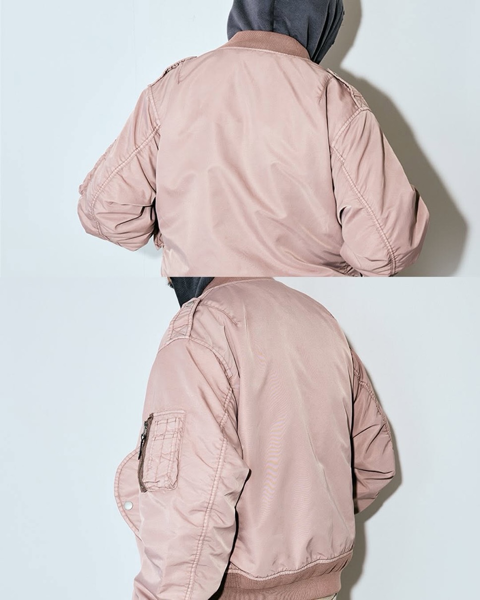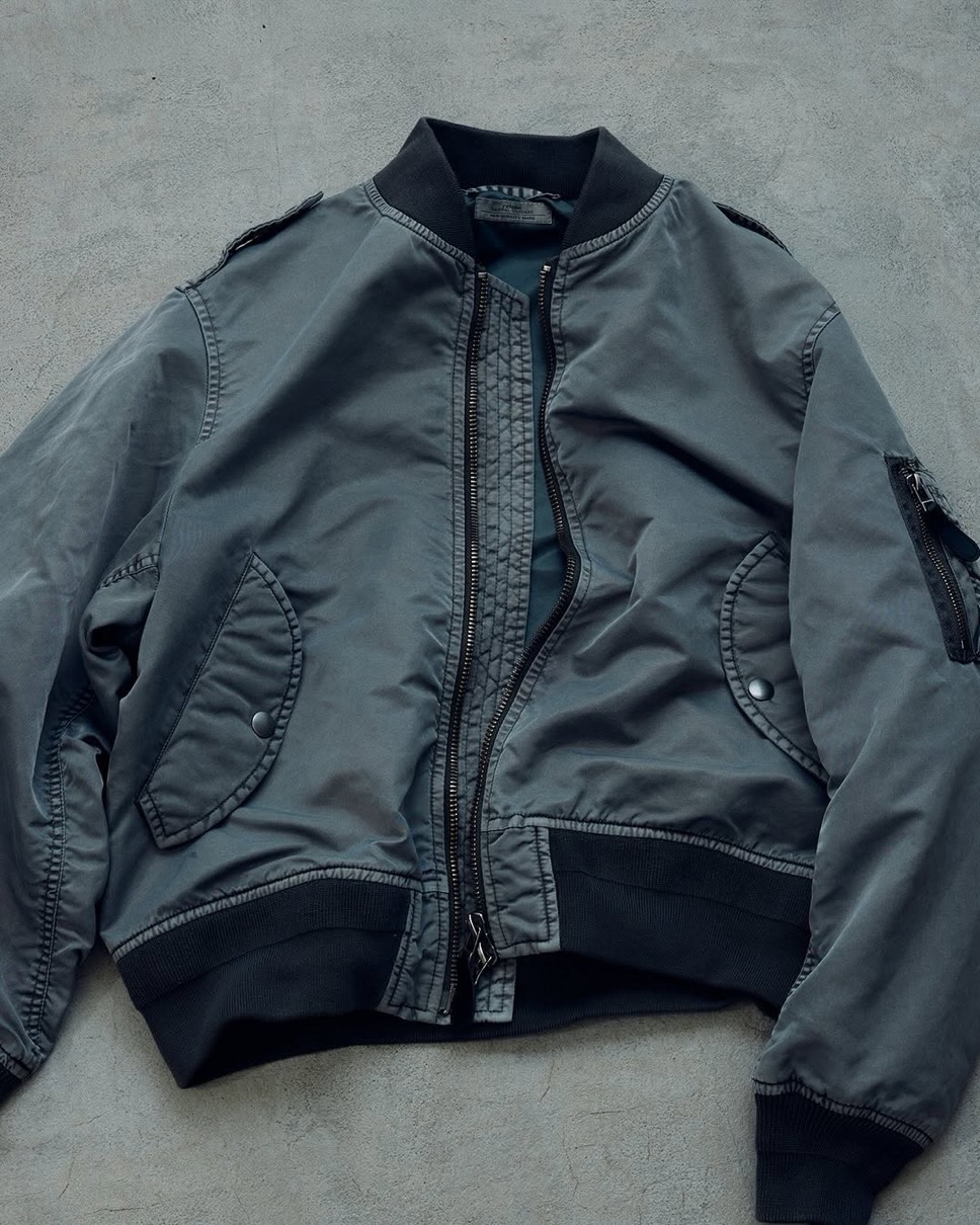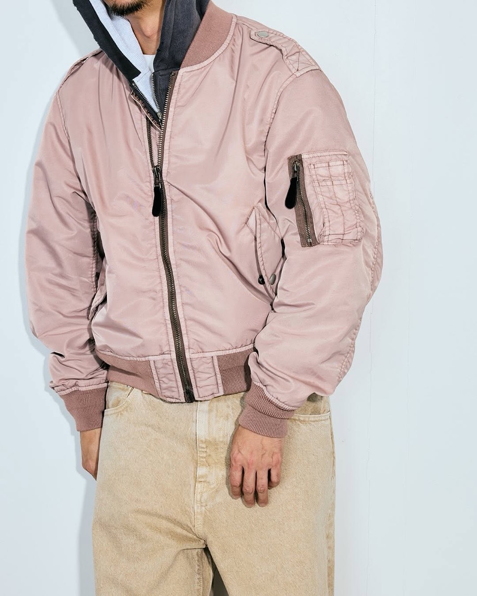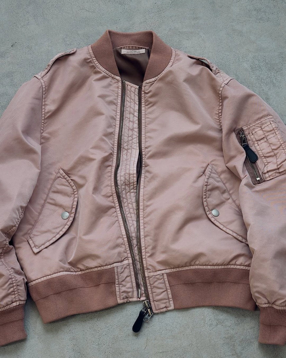 本格的なミリタリーディテールと、relumeらしい洗練されたシルエットが融合したフライトジャケットが登場。ナイロン100%のフライトクロスに、製品染め(ガーメントダイ)を施すことで、縫製後ならではのアタリや奥行きのある色合いを表現。軽量で防風性に優れ、ナイロン特有の表情を超えたヴィンテージライクな佇まいに。短めの着丈とオーバーサイズシルエットが生む、モダンなバランス感も魅力。大ぶりなファスナーやレザータブ、エポレットなど本格仕様を備えつつ、中綿なしのライトな着心地でレイヤードも自在。日常に溶け込みながら、確かな存在感を放つ一着、カラーはブラックとピンクの2色が展開する。