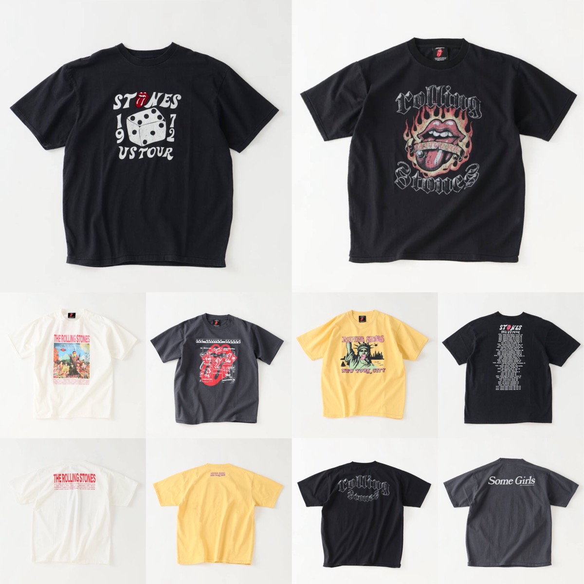 デザインは5タイプがラインナップし、ブラック(001)は1972年のUSツアーモチーフ。ダイスとLips and Tongue(リップス&タン)を組み合わせた王道ロックテイストな一枚。ブラックA(002)は1981年の名盤『Tattoo You』モチーフ。燃え盛るリップス&タンと、背面のオールドイングリッシュフォントがインパクト抜群。グレーA(007)は名盤『Some Girls』のジャケットをコラージュ。背面にはシンプルなタイポグラフィを配し、落ち着いたトーンに仕上げた。ホワイト(010)は1967年の名盤『Their Satanic Majesties Request』のサイケデリックなジャケットアートをフロントにプリント。イエロー(082)は1972年のニューヨーク公演をモチーフに、自由の女神が「Lips and Tongue」になった遊び心溢れるグラフィックとなっている。プリントに合わせて顔料プリントやインクジェットで仕上げ、時代を超えて愛されるバンドならではの、こだわりの一枚に仕上がった。