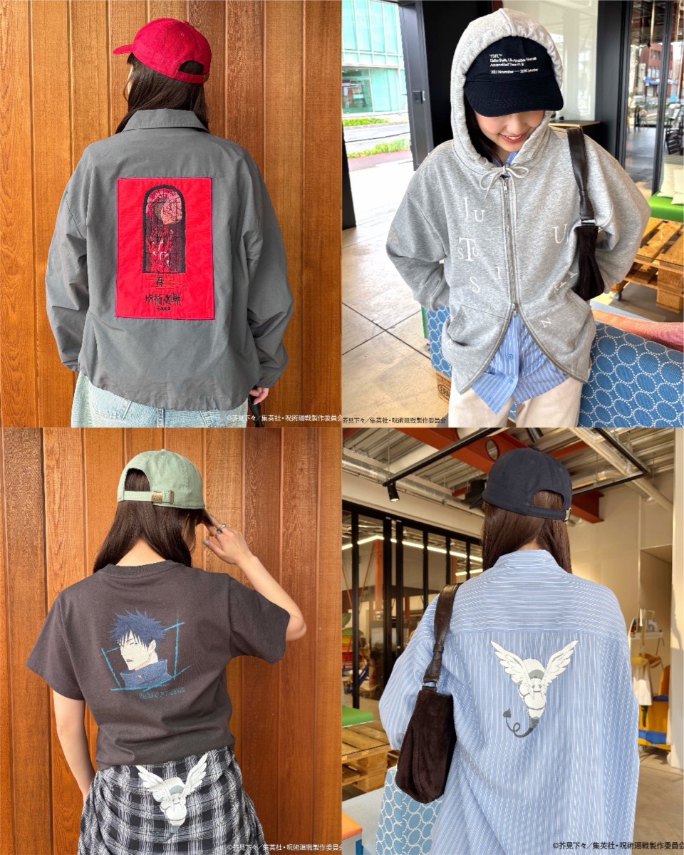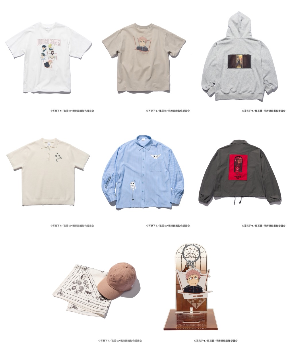 ファッションアイテムは、各キャラクターのイメージカラーを採用したTシャツや、第3期「死滅回游」のスーパーティザービジュアルを刺繍で表現したコーチジャケットに加え、虎杖悠仁と脹相が忌庫を覗き込むシーンや「死滅回游」へ向けて出発するシーンをプリントしたフーディーなどを展開。また、グッズセットのアクリルキーハンガーは、“窓の格子”をモチーフにデザインされています。一部アイテムには、本企画オリジナルのロゴを使用している。