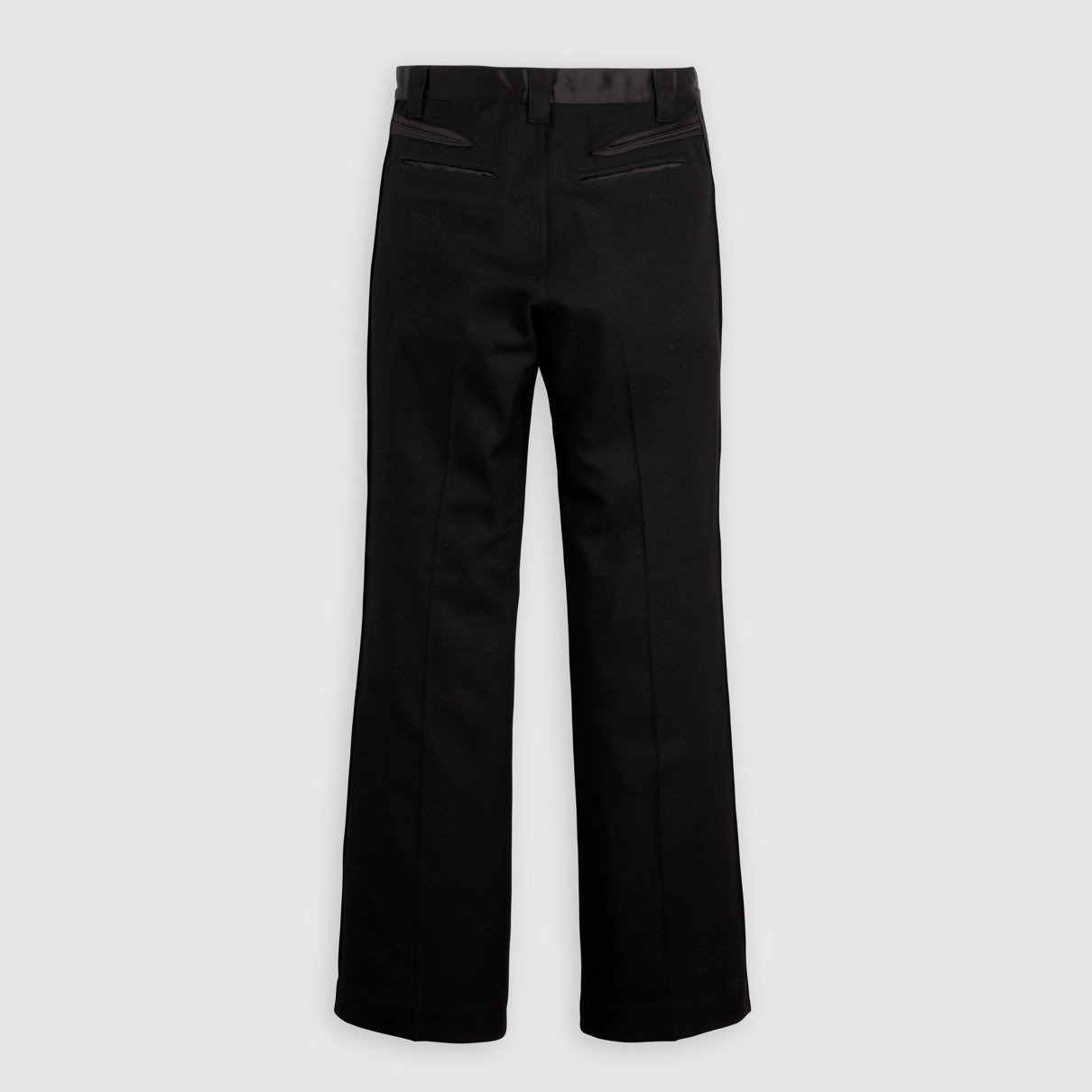 このコレクションのフォーマルな表現は、8 オンスのブラックポリエステルツイルを使用したスリムフィットのブレザー、Levi’s® x Kiko Kostadinov Andy Suit Jacket で最高潮に達する。ラペル、フロントプリーツ、ショルダーダーツ、袖のサテンディテールは、ブラックタイのフォーマルな装いの優雅さを彷彿とさせ、シャープなパーマネントプリーツは、1960年代にリーバイスがデニムに初めて導入したスタプレスト®の革新的な技術を表している。隠しボタン、シンチディテール、精密なダーツが、コスタディノフのシグネチャーである技術的な精密さをこの衣服に与えている。これに合わせて、Levi’s® x Kiko Kostadinov Andy Suit Trouser は、ブラックポリエステルツイル製で、バックダーツ、スラントフロントポケット、ワイドベルトループ、リアにシングルウェルトポケットがサテン生地の切りっぱなしのディテールで施された。