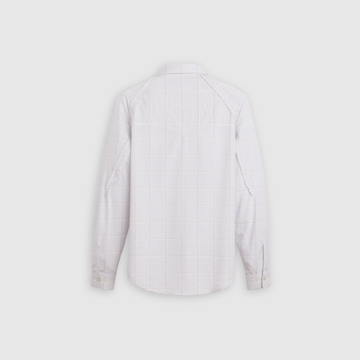 フォーマルとカジュアルの境界を埋める、Levi’s® x Kiko Kostadinov Andy Pattern Shirt は、軽量なグレーと白のウィンドウペーン織りのスタンダードフィットシルエット。露出したシェルボタン、ウェルト付き胸ポケット、バックヨークのトップステッチのディテールが、あらゆるシーンにシームレスに溶け込む洗練されたベースを作り出している。