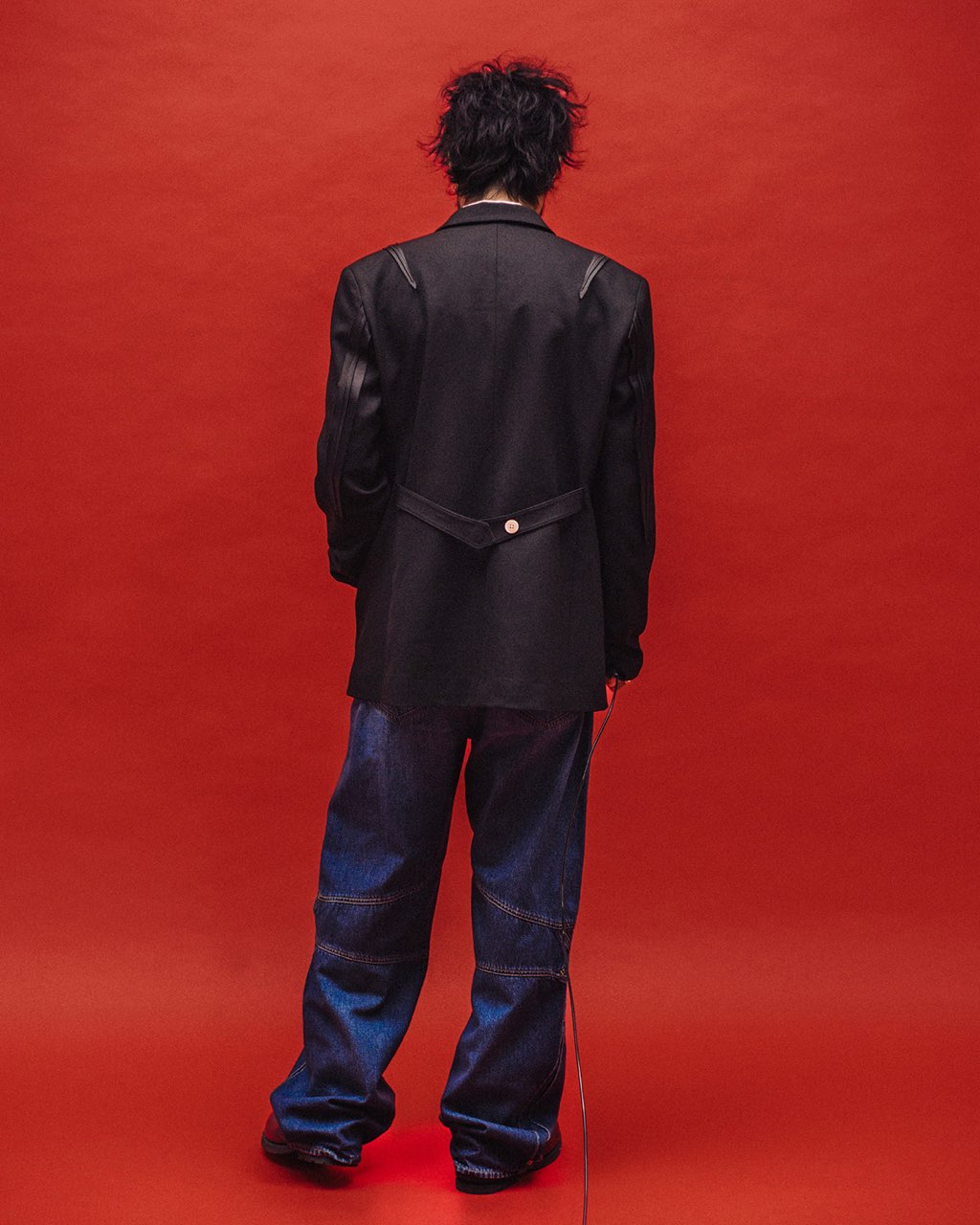 このコレクションのフォーマルな表現は、8 オンスのブラックポリエステルツイルを使用したスリムフィットのブレザー、Levi’s® x Kiko Kostadinov Andy Suit Jacket で最高潮に達する。ラペル、フロントプリーツ、ショルダーダーツ、袖のサテンディテールは、ブラックタイのフォーマルな装いの優雅さを彷彿とさせ、シャープなパーマネントプリーツは、1960年代にリーバイスがデニムに初めて導入したスタプレスト®の革新的な技術を表している。隠しボタン、シンチディテール、精密なダーツが、コスタディノフのシグネチャーである技術的な精密さをこの衣服に与えている。これに合わせて、Levi’s® x Kiko Kostadinov Andy Suit Trouser は、ブラックポリエステルツイル製で、バックダーツ、スラントフロントポケット、ワイドベルトループ、リアにシングルウェルトポケットがサテン生地の切りっぱなしのディテールで施された。