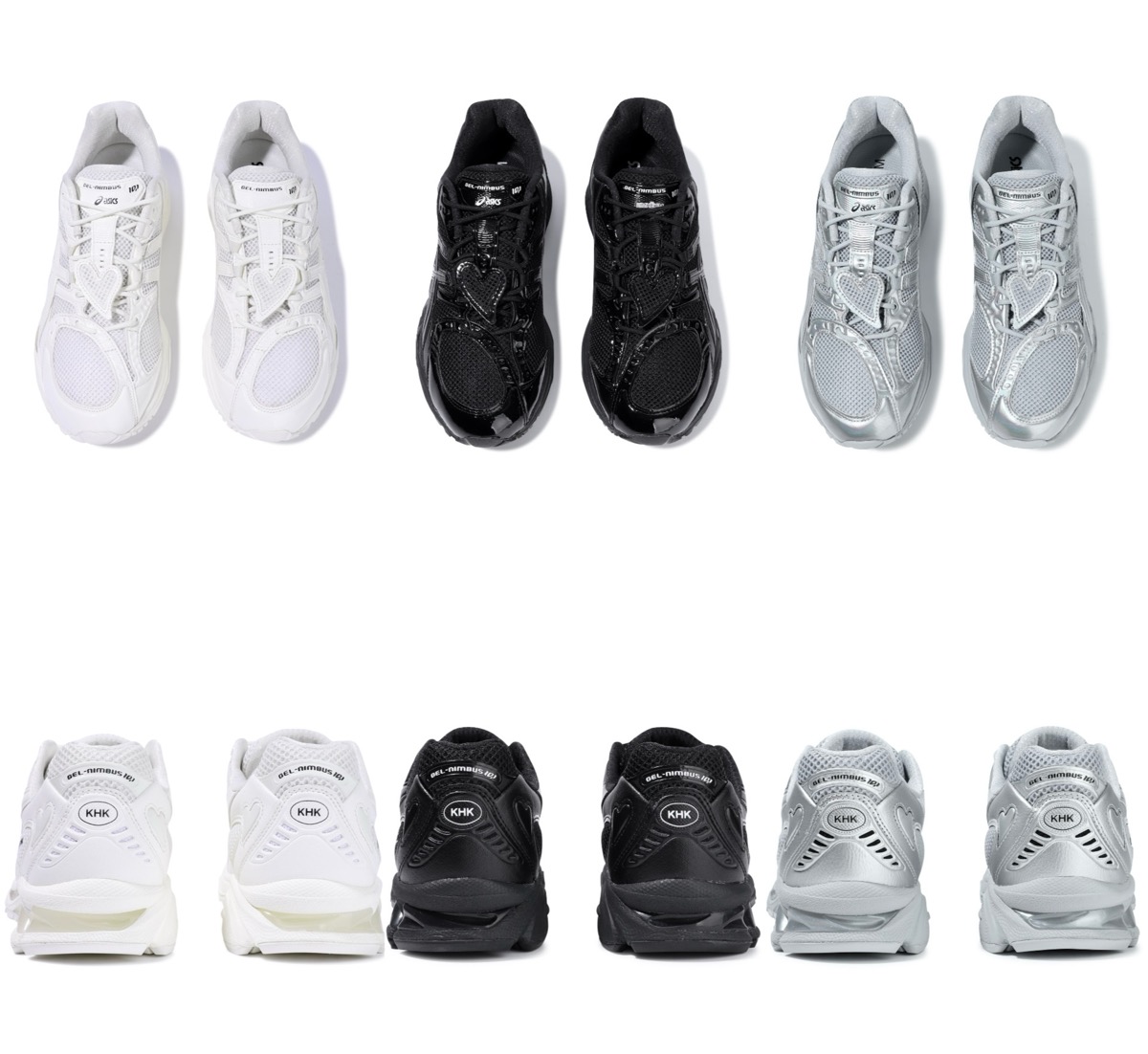 本コラボレーションでは、KIMHĒKIMが5種類の対照的な素材を重ね合わせながらシームレスなモノクローム調に仕上げ、随所にシグネチャーであるハートエンブレムが自然に浮かび上がる洗練されたバランスを実現。ASICSの技術革新とKIMHĒKIMの実験的でありながら遊び心あるデザイン哲学が融合したスニーカーが誕生した。カラーはアイボリー、ブラック、シルバーの3色展開。