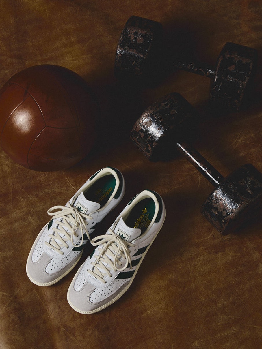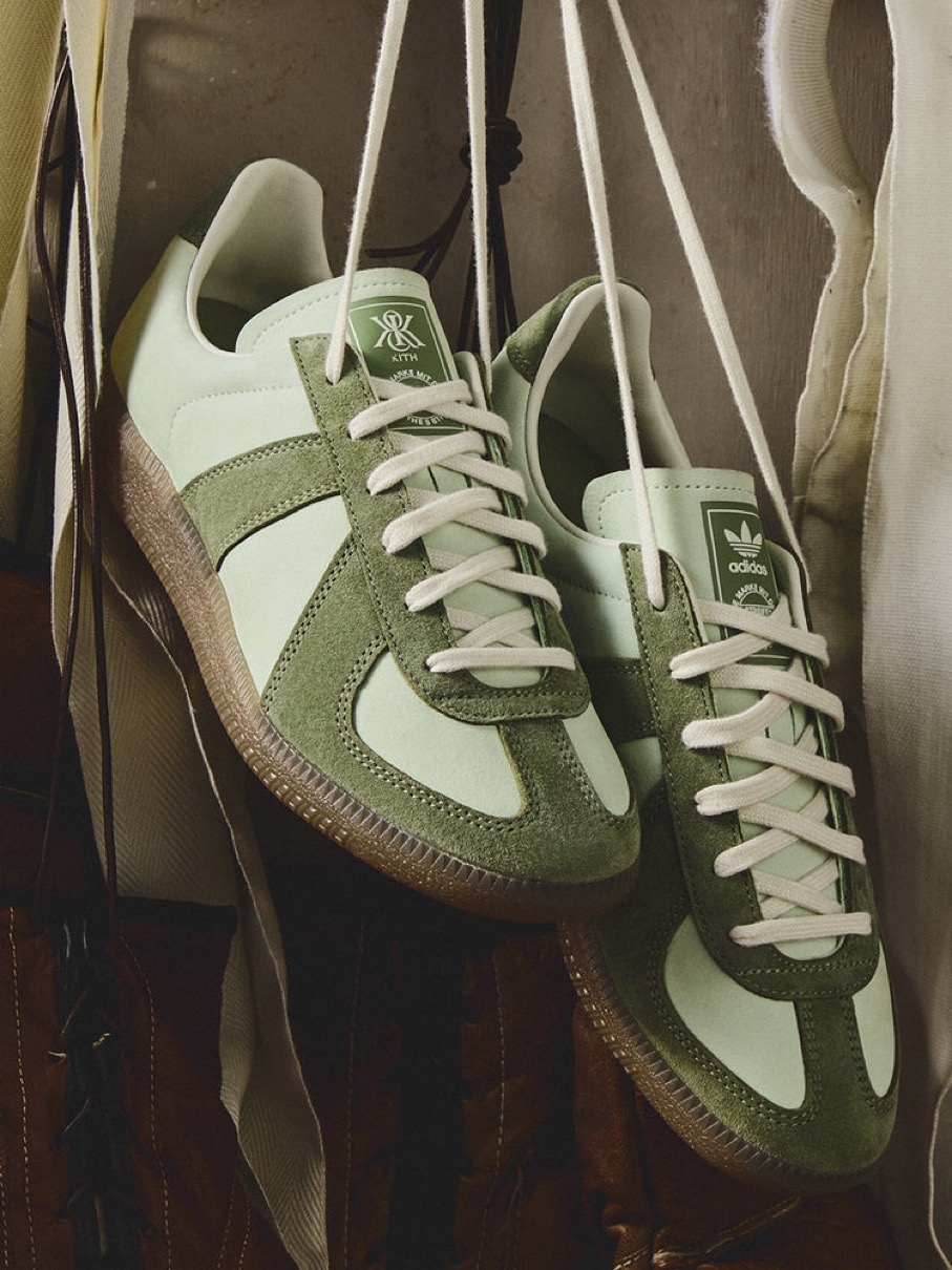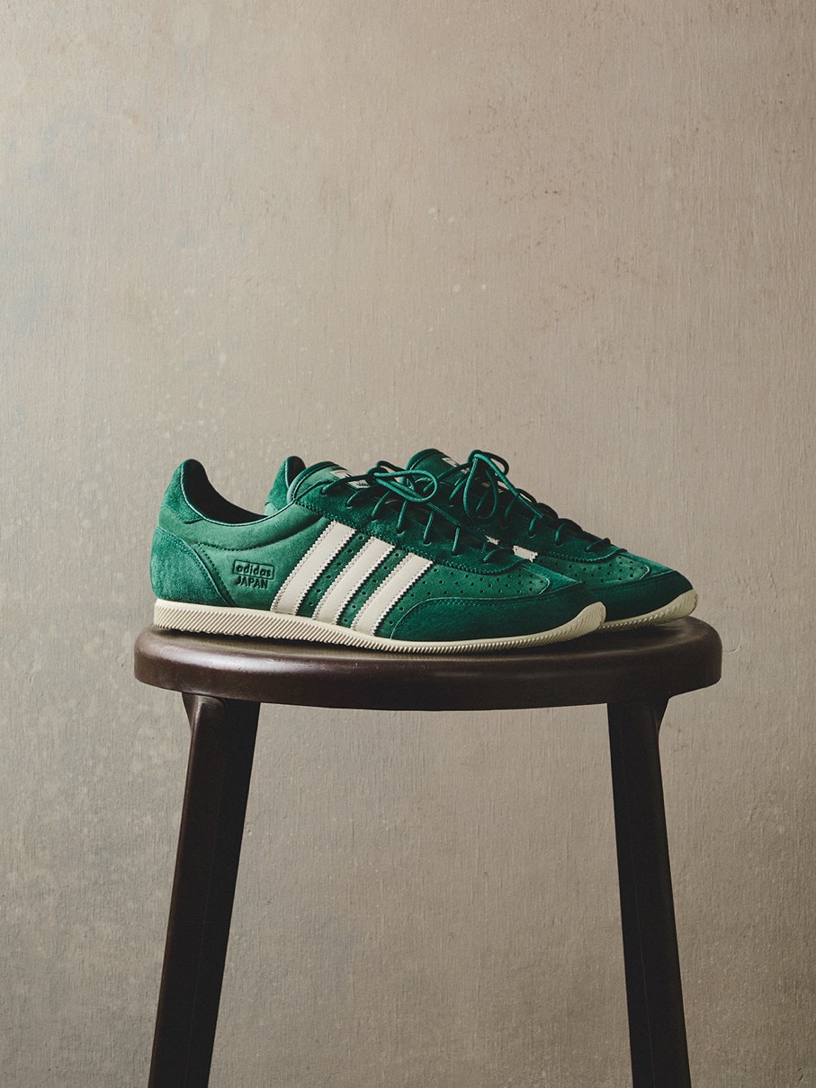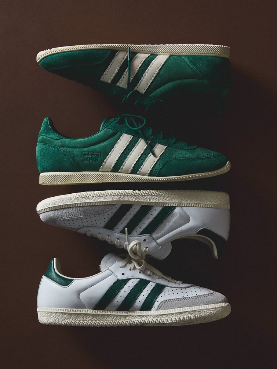 過去のKith Classics for adidas Originalsコレクションでも展開されたSambaとJapanも、今季はEvergreenのカラーリングで登場。Collegiate Green、White、Blackのカラーブロッキングが特徴で、Samba は、レザーアッパーにクラシックなスエードのT字デザインを備えつつ、つま先部分にはパーフォレーションを施した仕様へとアップデート。フットベッドとサイドにはKithのブランディング、シュータンにはadidasロゴ、ヒールには左右で異なるデボス加工が施されている。Japan は、全面にヌバックを採用し、つま先部分にはパーフォレーションを備え、Sambaと共通のブランディングを採用。Japanは本コレクションの中で唯一、ラウンドレース仕様となるモデルとなっている。