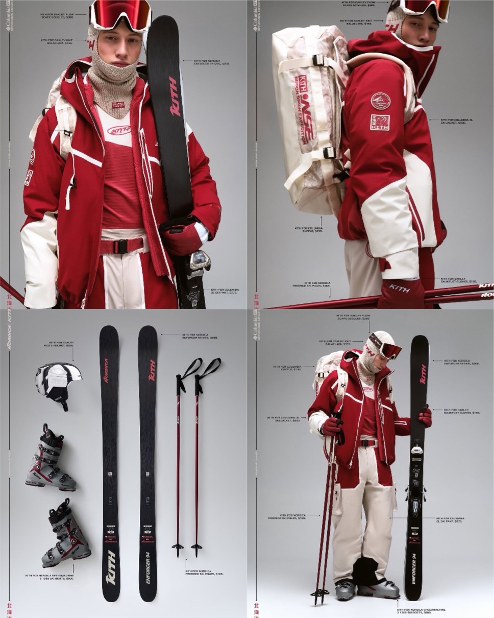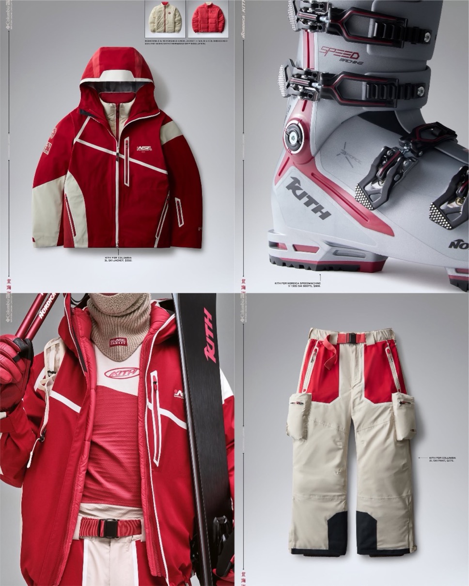 さらに、Kith は Columbia Sportswearとともに、Capita、Nordica、Union Binding Company とパートナーシップを組み、山岳環境での高いパフォーマンスを追求した、カスタムスキーおよびスノーボードギアの初コレクションを発表。Kith for Capita 158 Snowboard は、アパレルコレクションから着想を得たアートワークを全面に配した2種類のデザインで展開され、Nippon Snow Expedition のブランディングを施している。加えて、あらゆるレベルのスキーヤーに向けて、Kith for Nordica Enforcer 94 および Unleashed 106 のスキーセットをラインナップ。クロスカントリーからアルペンまで幅広いシーンに対応する、優れた汎用性を実現する All Mountain ロッカー構造を採用。さらに、最適化されたグリップを備える Freeride Pro および Unlimited Ski Poles、そして Kith 初となるスキーブーツシルエットである Speedmachine 3 130S Ski Boot を、幅広い雪質に対応する All Mountain 仕様として2色で展開。Union Binding Company との協業により誕生した Strada Binding は、パークおよびフリースタイルスノーボーディングにおいて高い評価を得るモデルとして知られ、Kith 限定の2色で展開される。