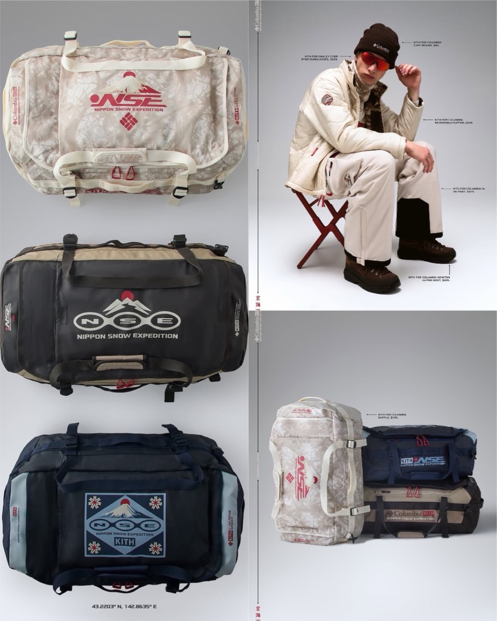 コレクション名の通り、スノーエクスペディションを想定してデザインされた Kith for Columbia NSE のアクセサリーコレクションでは、複数のハンドルポイントを備えたキャリーオール仕様のダッフルバッグを展開。多様な持ち運びに対応する設計に加え、中身を安全に収納できるポケット、収納可能なストラップ、カスタムアートワークを採用しています。