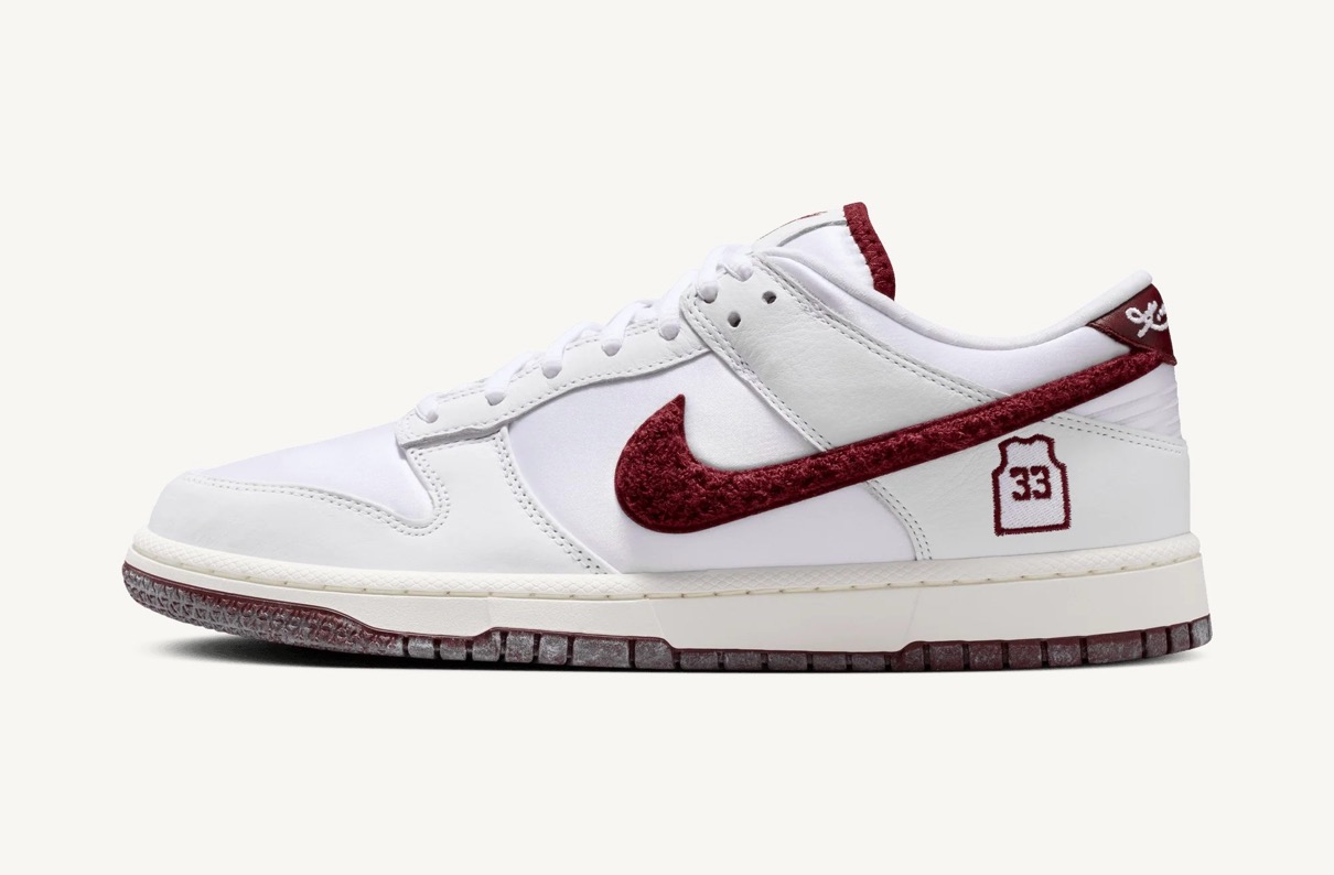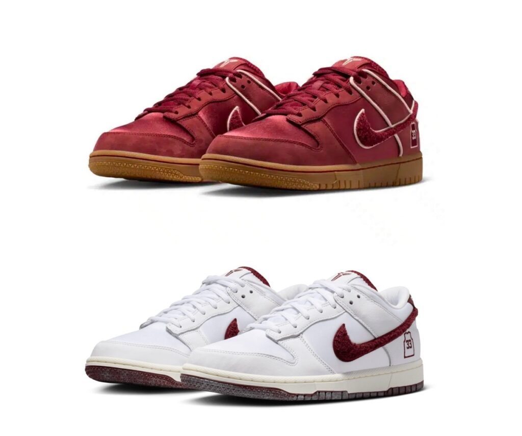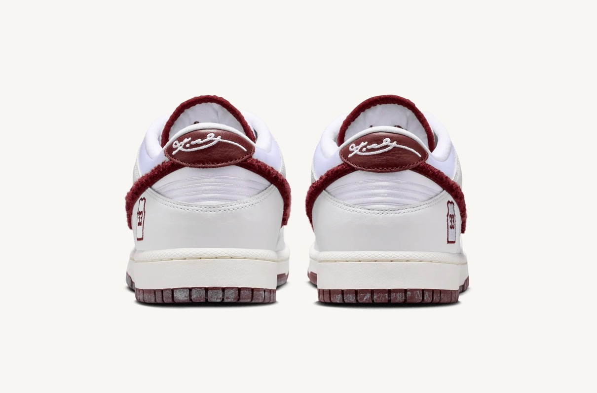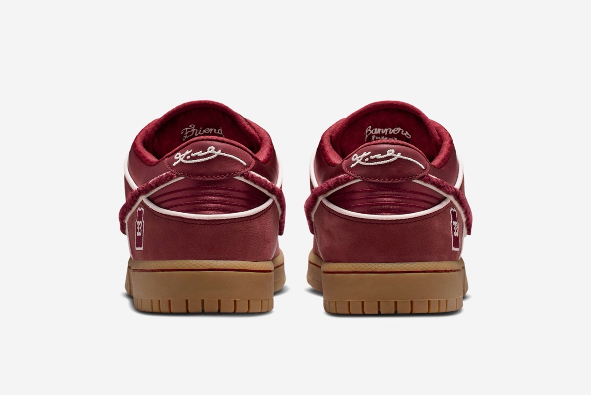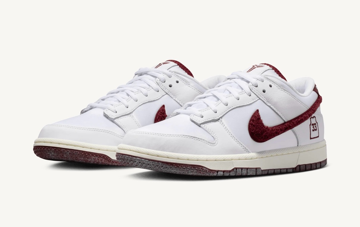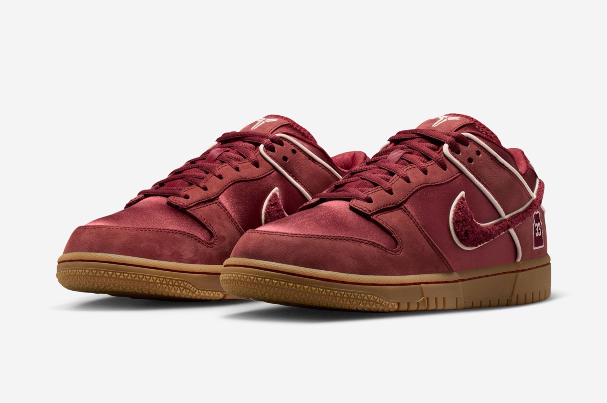 アッパーはスエードとサテン素材の組み合わせで構築し、スポーツとストーリーテリングを結びつける洗練されたルックスを実現している。ヒール部分には、標準的なブランドロゴの代わりにブライアントのローワー・メリオン時代の背番号「33」のユニフォームロゴが配され、ヒールタブには彼のシグネチャーが刺繍されている。また、タンにはコービーのシースロゴもあしらわれ、このダンク・ローをマンバのアイデンティティと直接結びつけている。その他のディテールも、このオマージュをさらに深めている。シュータン裏には「Friends hang sometimes, banners hang forever(友人は一時的に寄り添うが、優勝旗は永遠に掲げられる)」というフレーズが刻まれており、これは勝利への執念を反映したブライアントの精神を表している。スニーカーの内側には、バスケットボールのネットの織り目を模したカスタムライニングが施され、さらにテーマを強調する。