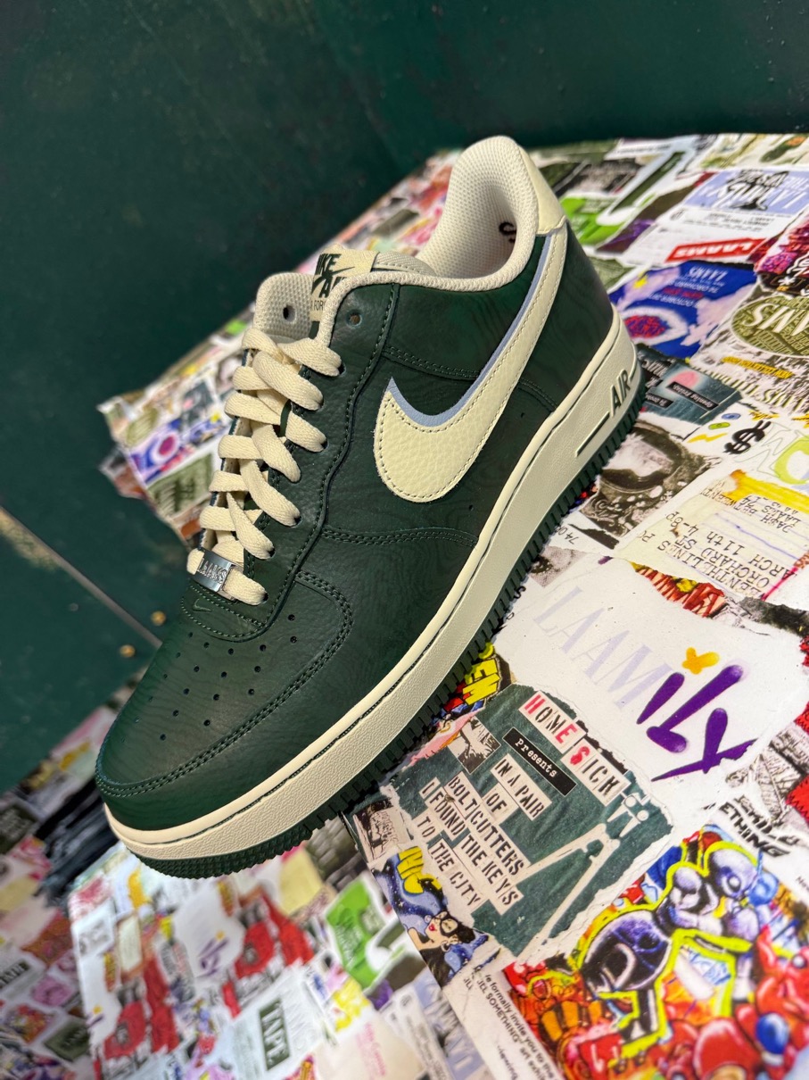 ラスベガスで開催されたコンプレックスコンで新たな一足が初披露。ストリートカルチャーと高いデザイン性が見事に融合し、マンハッタン・ダウンタウンのスタイルを体現している。エクストラ・バター(Extra Butter)のブレンダン・ダン(Brendan Dunne)とバーニー・グロス(Bernie Gross)が公開したこの一足では、アッパーがダークフォレストグリーンの木目調テクスチャーで覆われ、街中の建設現場に並ぶ合板バリケードやコラージュされたポスターウォールへのオマージュとなっている。クリームカラーのタンブル加工レザーオーバーレイとヘリテージスタイルのシューレースがハンドメイドの仕上げを演出し、スウッシュの裏に配されたブルーとソール裏のネオングリーンのアクセントが遊び心をプラス。この荒削りと洗練の融合は、まさにLAAMSの世界観にぴったりだ。
