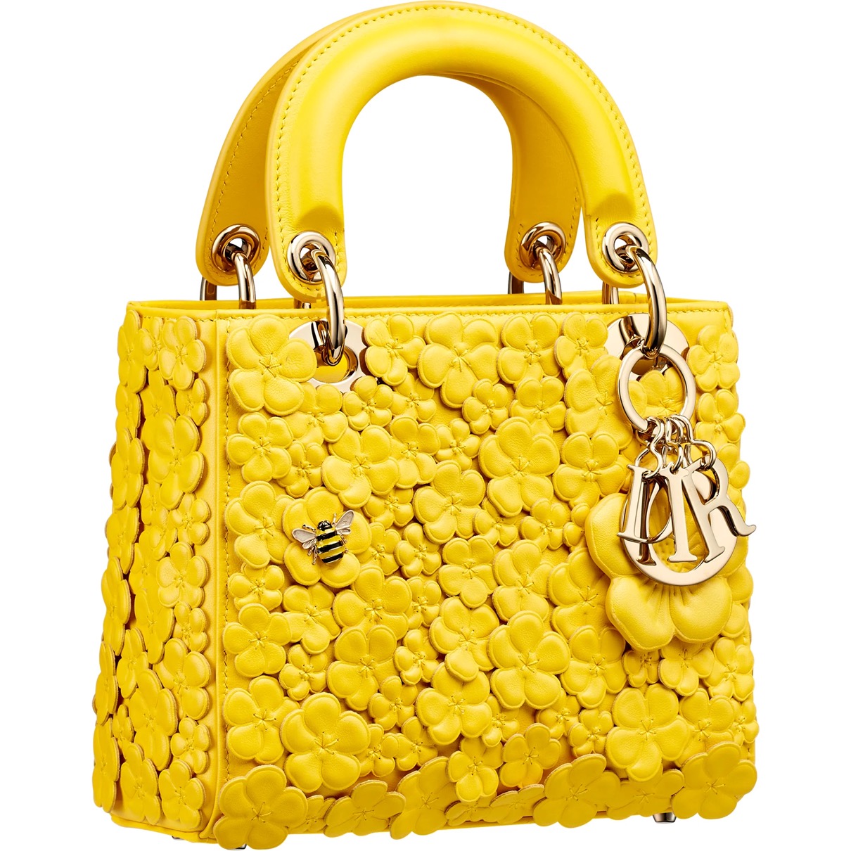 一方、ミニサイズの「レディ ディオール バターカップ」は、バッグ全体に立体的に表現されたキンポウゲの花のモチーフが散りばめられたデザインで、鮮やかなイエローが際立つユニークなモデル。究極のディテールとして、メゾンのお守りのようなエンブレムである小さなミツバチが光り輝く花々から花粉を集めているように描写され、“D. I. O. R.” チャームがこれらのクリエイションを華やかに完成させる。