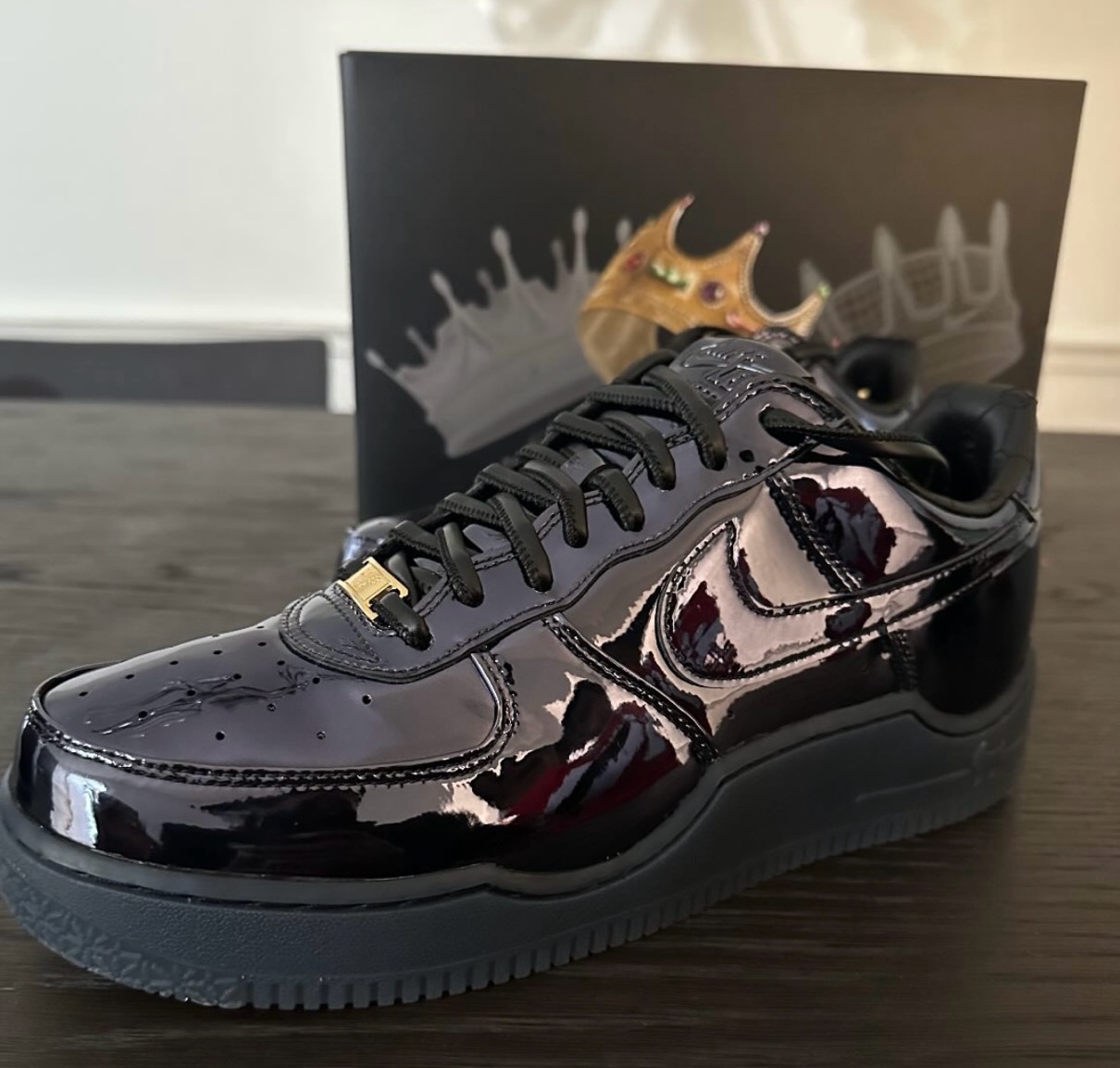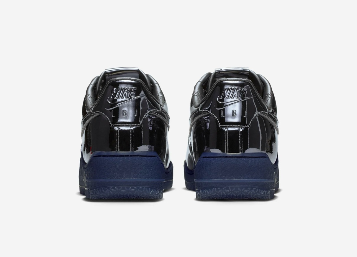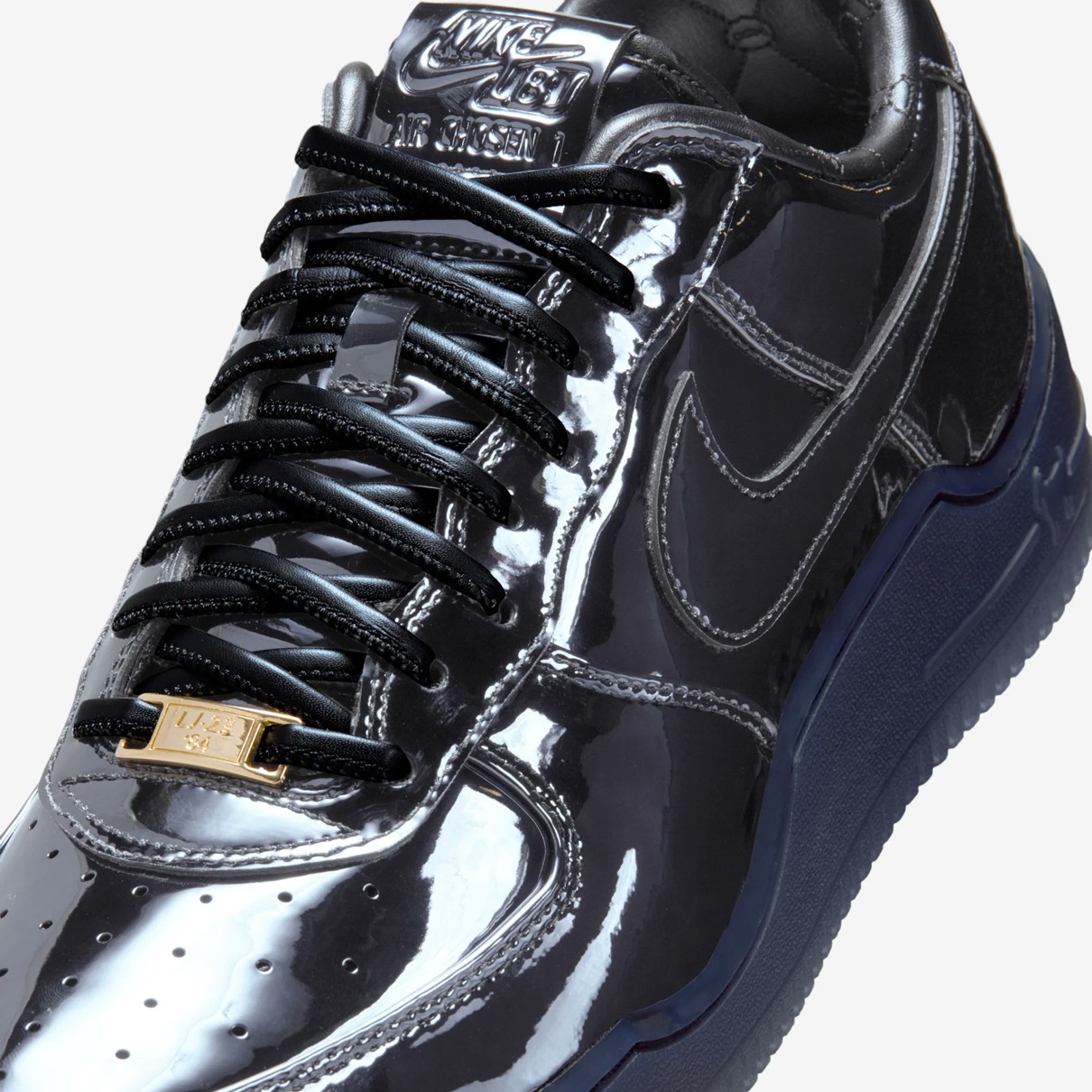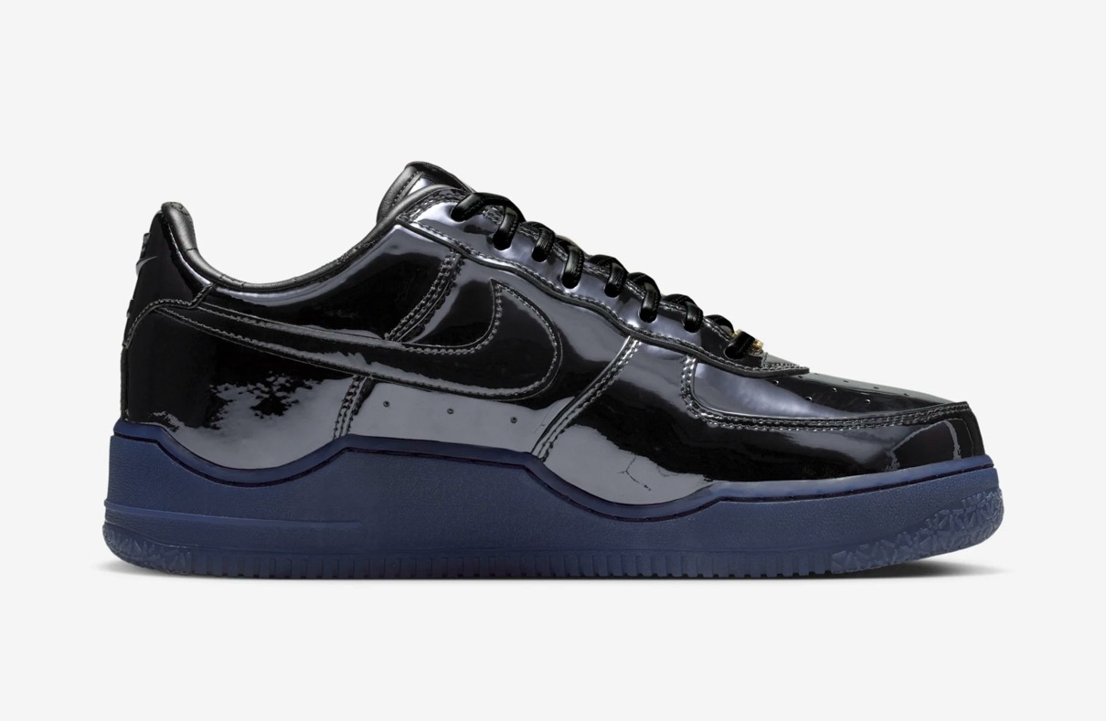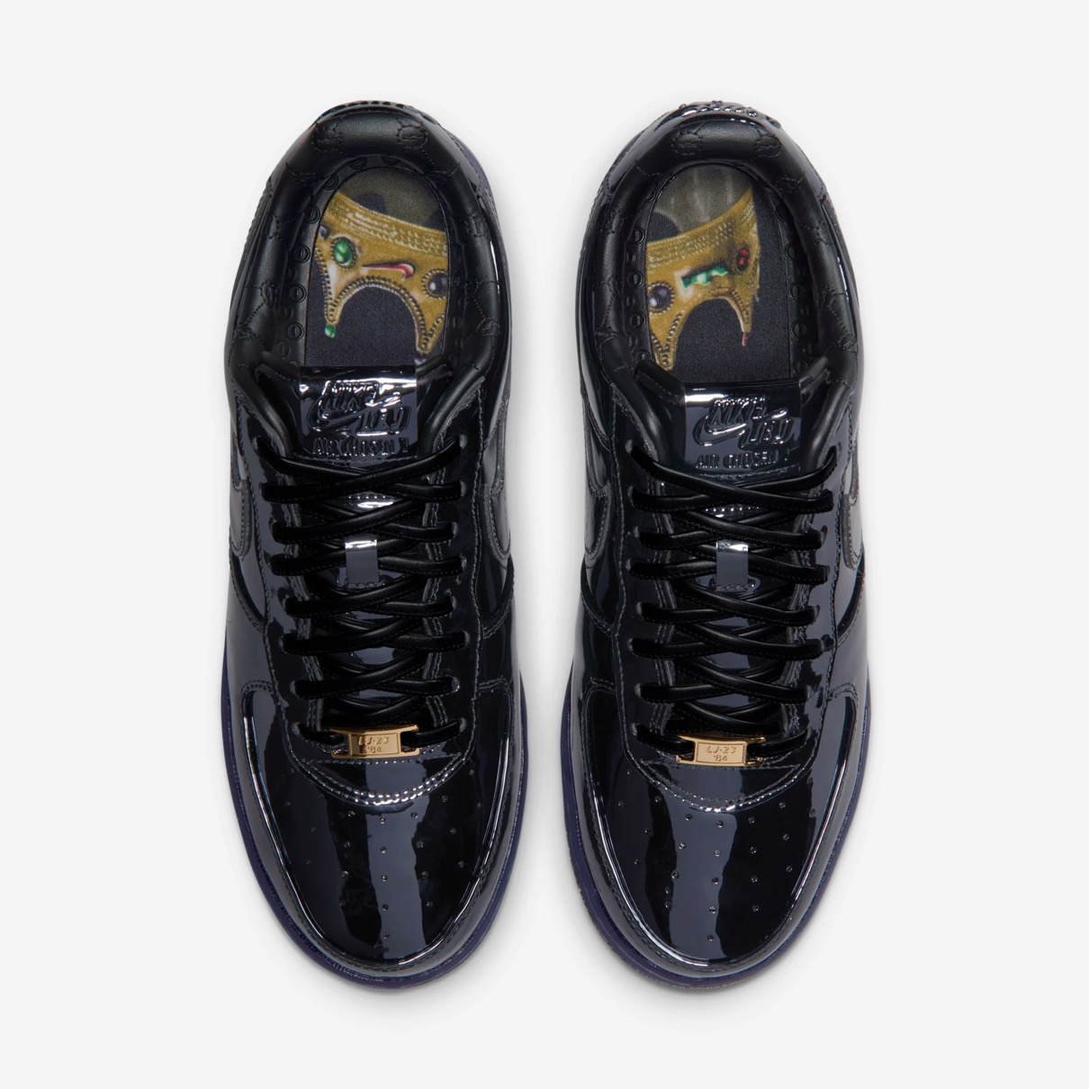アメリカ大統領専用飛行機『エアフォースワン』にちなんで命名され、1982年にナイキ エアを初めて搭載したバスケットボールシューズとして誕生した「Air Force 1(エアフォース1)」。NBAのスーパースター・レブロン本人が着用したこのモデルでは、艶感のあるドレッシーなパテントレザーでアッパーを構築。最も特徴的なディテールとして、キングを象徴するクラウン型デザインのミッドソールが採用されており、ソールのサイドにはGOAT(ヤギ)のロゴが刻印。さらに、インソールには王冠のグラフィックがプリントされ、アウトソールの溝の形状も変更されている。