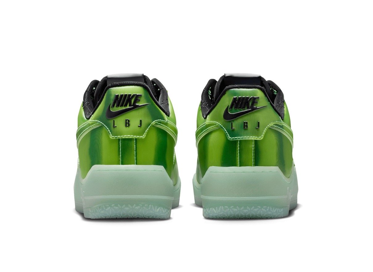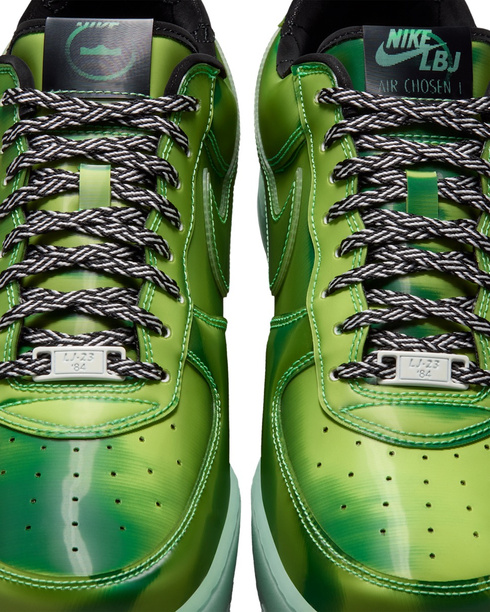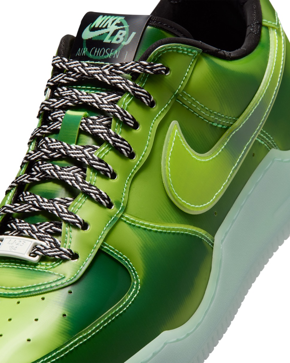 今作ではレブロンのLAとの繋がりを祝し、ハリウッドの魔法を象徴するグリーンスクリーンをイメージしたAF1をデザイン。レンズ状のアッパーは動きに合わせて変化し、暗闇で光るソールとスウッシュの輪郭が鮮やかなコントラストを添える。大胆なシューズ内部には、特殊効果のレンズを通して見えるキング・ジェームズの王冠をあしらったソックライナーを採用。ドロップインフォームミッドソールとヒール部のズームエアを搭載し、驚異的な快適性を実現している。