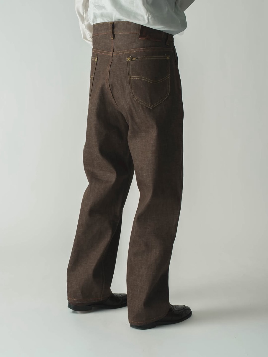 101-Zパンツのバックポケットは大型ポケットから、小ぶりなシェイプに変更され、アイコニックなレイジーSステッチが施される。フロントもボタンフライからジッパーとなり現代的に。そんな101-Zをベースとした今作では、ハイウェスト、シルエットはストンと落ちるワイドシルエットに大きく変更。ワイドシルエットの迫力と流麗さが、リジットデニムの張り感と艶と相まって、デニムながら上品でクラス感があるプロダクトに。セットアップでの着用ができる今作は、ブラウン、ネイビーの2色展開。