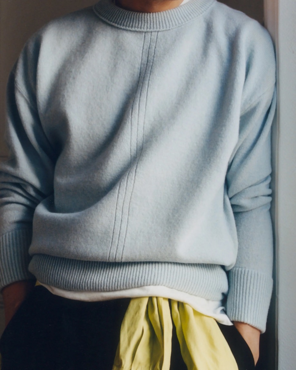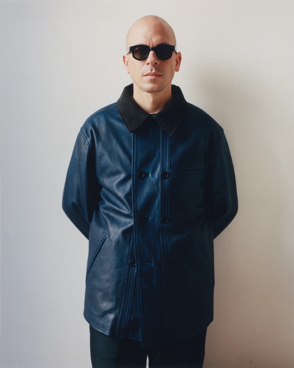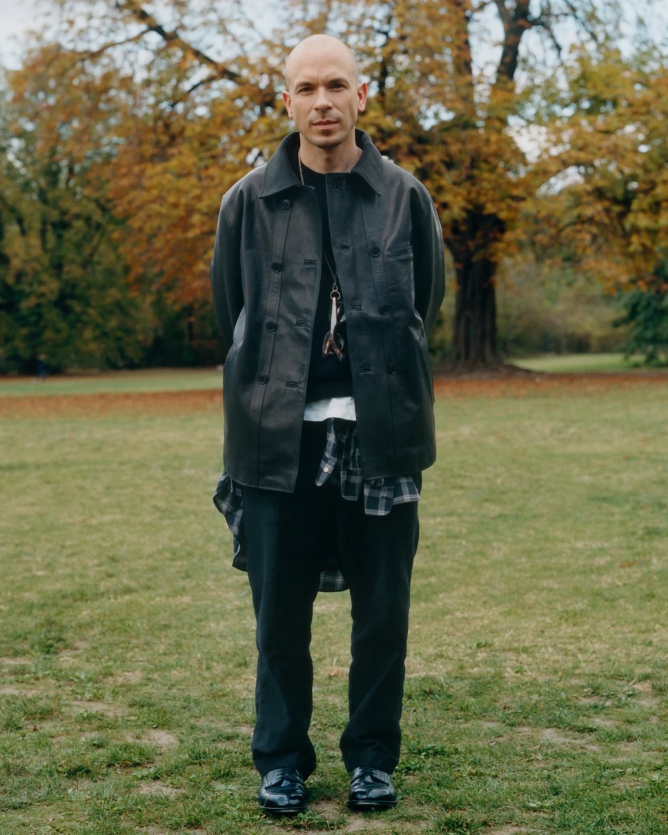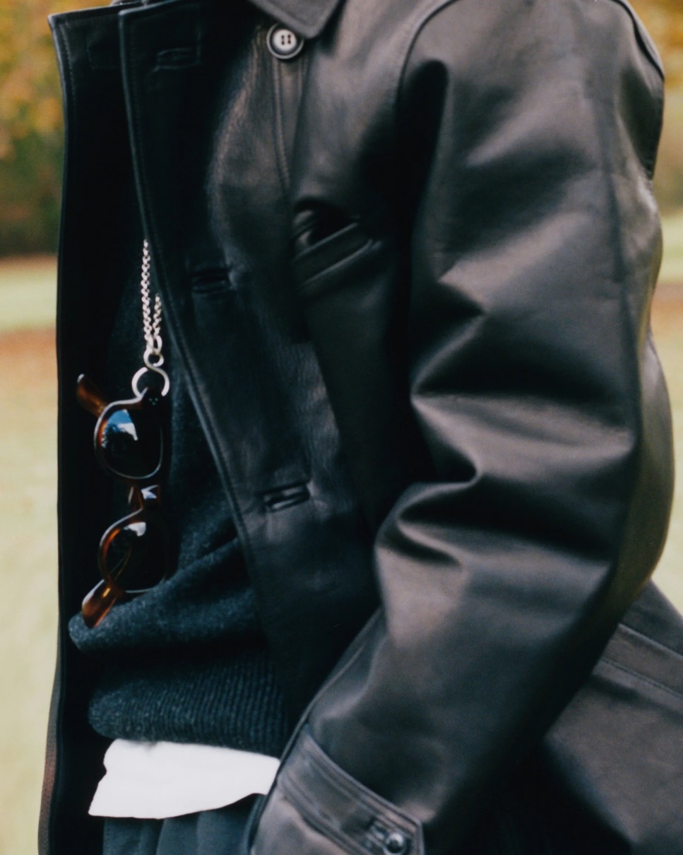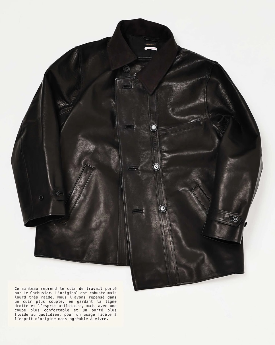 ジャケットは建築家のル・コルビジェが愛用したレザージャケットをベースに作成。オリジナルは重厚で非常に硬い個体が多い中、直線的なラインと実用性はそのままに、より快適なカッティングと、日常の着用に適した滑らかな着心地を再現。オリジナルのデザインの精神を保ちながら、現代的で着やすいコートへと仕上げた。