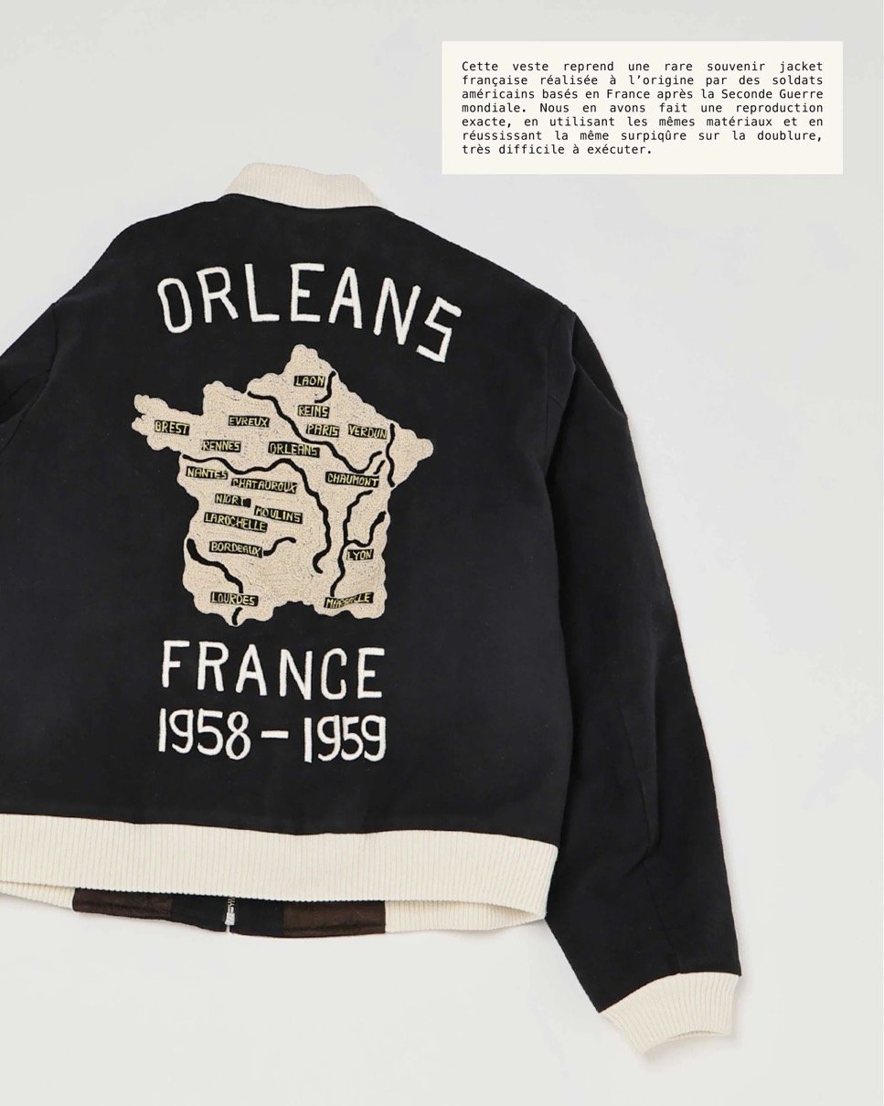 第二次世界大戦後、フランスに駐留していたアメリカ兵によって作られた希少なフランスのスーベニアジャケットをベースに作成。表地素材はコットンモールスキンを使用、裏地の非常難しいステッチワークも忠実に再現。