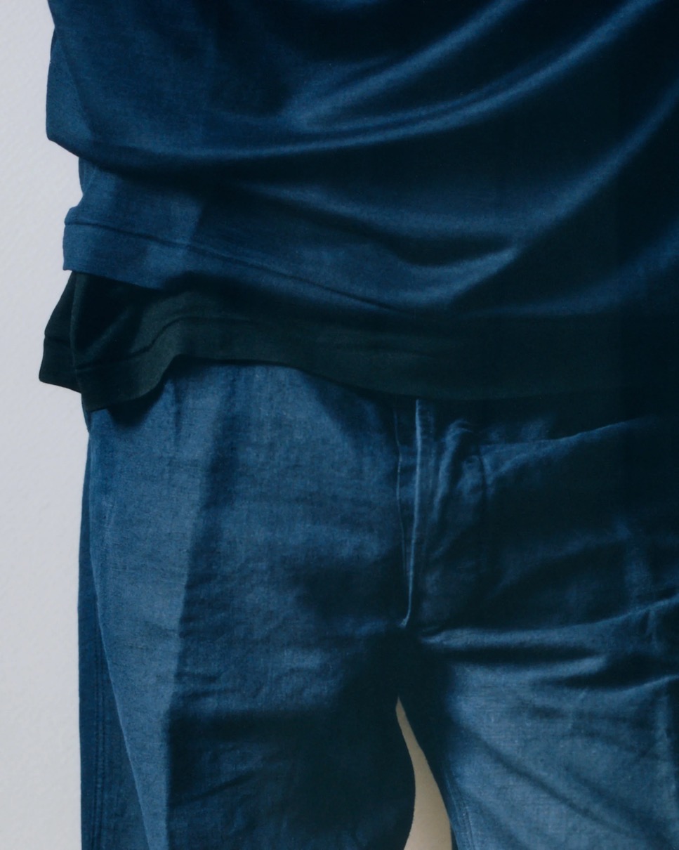 天然のINDIGOを手染めで仕上げた。白いカーフレザーを職人がハンドで染め上げており、非常に深みのある色合いに仕上がった。VINTAGEでも希少な襟ウールのコルビジェジャケット。やわらかいウール/コットン 混紡のメルトンにワッシャー加工をかけて自然な風合いを出し、裏地にはギザコットンのライトモールスキン、本来裏地に使う生地より格段に高級な生地を使用。