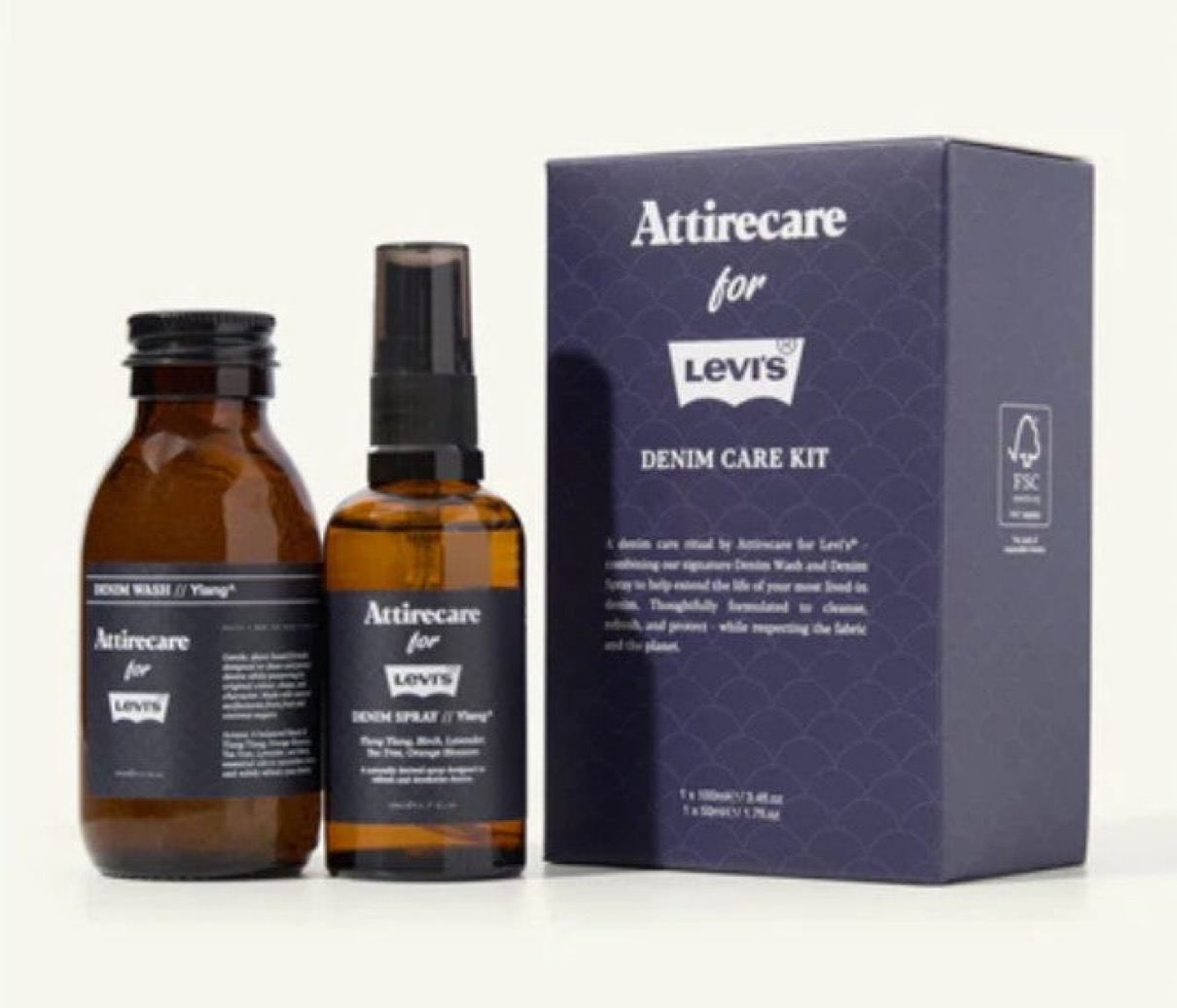 着用後のデニムを清潔に保つ、天然の植物由来のデニムファブリックスプレー(50ml)と、デニム用に特別に開発されたデニムウォッシュ(100ml)のトライアルサイズをセットにしたデニムケアキット。柔らかく落ち着いたイランイランの香り。
