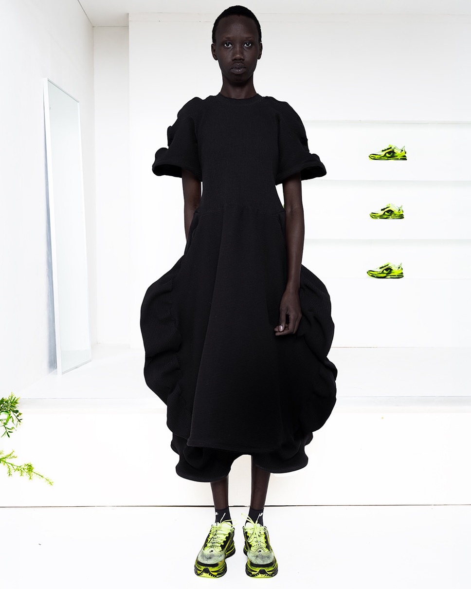今回のコラボレーションモデルでは、バウマイスターの彫刻的アプローチを反映した焼け焦げたような美学で、ナイキのデザインを実験的な領域へと押し進める。全米デザイン賞受賞の勢いそのままに、デザイナーは初のナイキプロジェクトに臨み、「Run Like No One Is Watching」カプセルコレクションの中で際立つ作品を生み出した。
