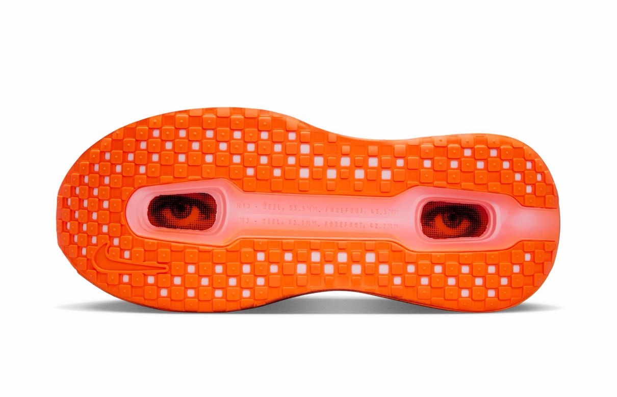細部にも物語性が込められており、タンカラーのソックライナーはナイキのクラシックなパッケージングを彷彿させ、アッパーサイドの「AIR」文字と黒のスウッシュは過去モデルのブランディングを想起させる。シュータンにはレンチキュラーの瞬きする目がデザインされ、アウトソール内部には、前足部とヒールの窓部分にプリントされた目が隠されており、バウマイスターのシュルレアリスム的な示唆と、調和する遊び心のあるひねりを加えている。このアプローチは、スワロフスキーの装飾モデルやその他のハイファッションコラボに見られるように、オートクチュール志向のランナーが主流となる現代の潮流に合致している。