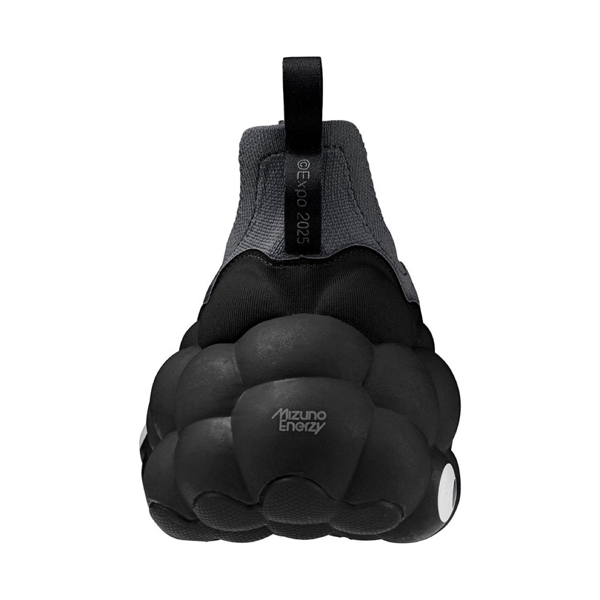 2024年に登場した赤青カラーに続き、ブラック&グレーで仕上げた新色が登場。「THE MIZUNO ENERZY」をベースとしたモデルで、後足部から前足部にかけて、「MIZUNO ENERZY」の中でも最も柔らかく反発性の高い「MIZUNO ENERZY CORE」を使用。これにより、柔らかい履き心地を体感しながら、後足部では接地時の衝撃を緩和し、前足部への体重移動をサポート。また、前足部では高い反発性により力強い蹴りだしをサポートし、接地から蹴りだしまでスムーズな足運びが期待することができる。アッパーはニット素材で通気性が良く、高いフィット感を実現。ミャクミャクをイメージした、ミッドソールの凹凸感が特徴的なシューズだ。