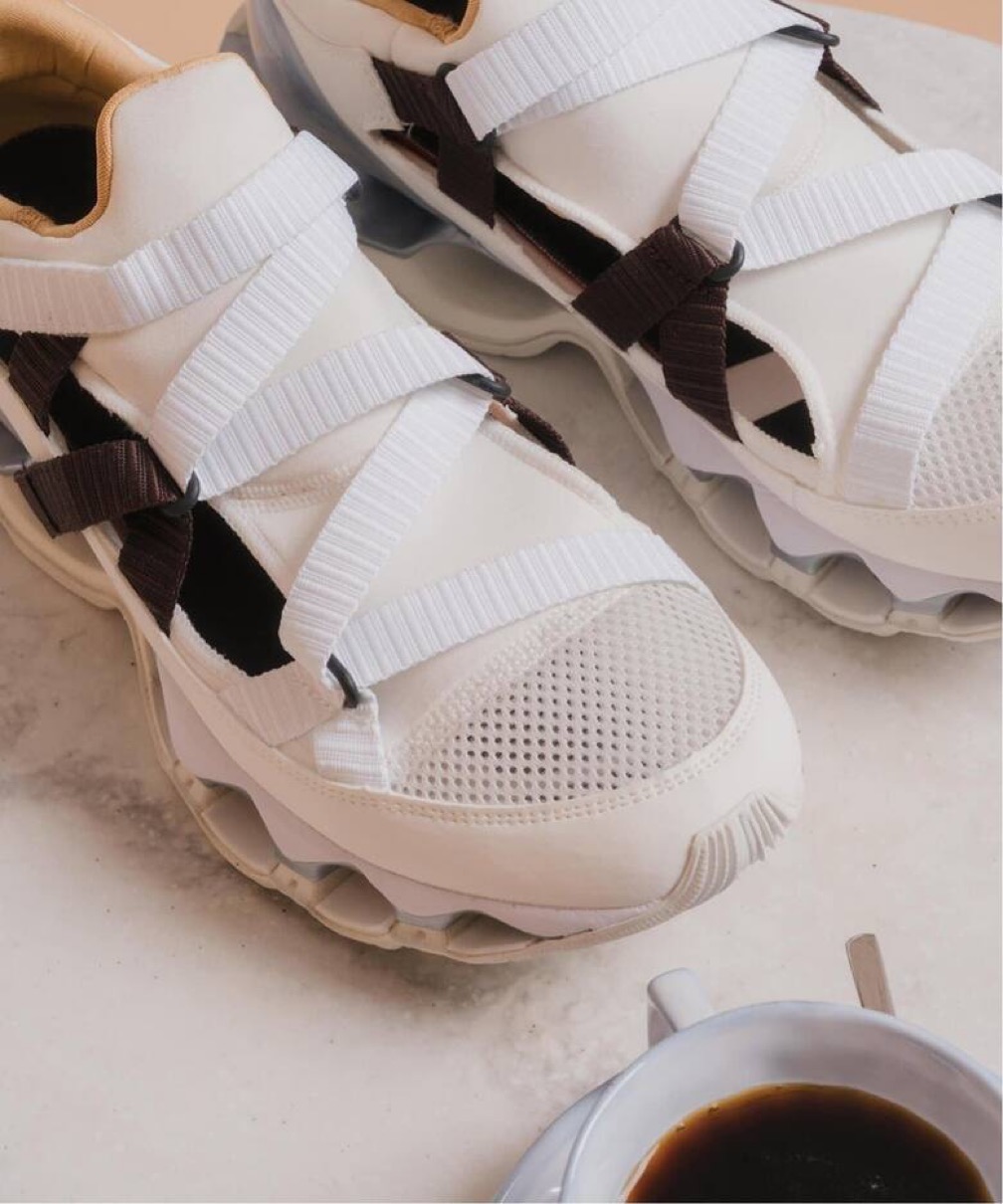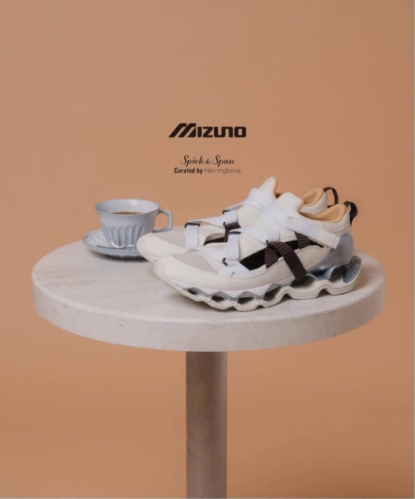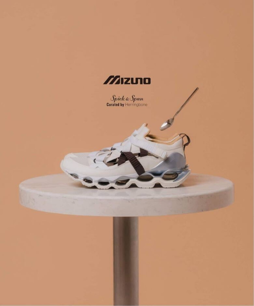 踵は、足を包み込むような伸縮性の高いメッシュとヒールカウンターでホールド感を高め安定感のある設計。最大の特徴は、ミズノが独自に開発したウエーブプロフェシーソールで、空洞のあるインフィニティ構造のウエーブプレートを採用し、ミッドソールがへたる原因を抑えている。”Coffee creamer”の愛称が付けられた本作は、コーヒー、ポーションタイプのミルク、ティースプーンから着想を得たカラーパレットを採用し、日本のノスタルジックな喫茶文化をモダンに表現。機能的なディテールにユニークなストーリーを織り交ぜて提案するスペシャルエディションで、<Spick & Span>、<Herringbone Footwear>にて限定販売される。