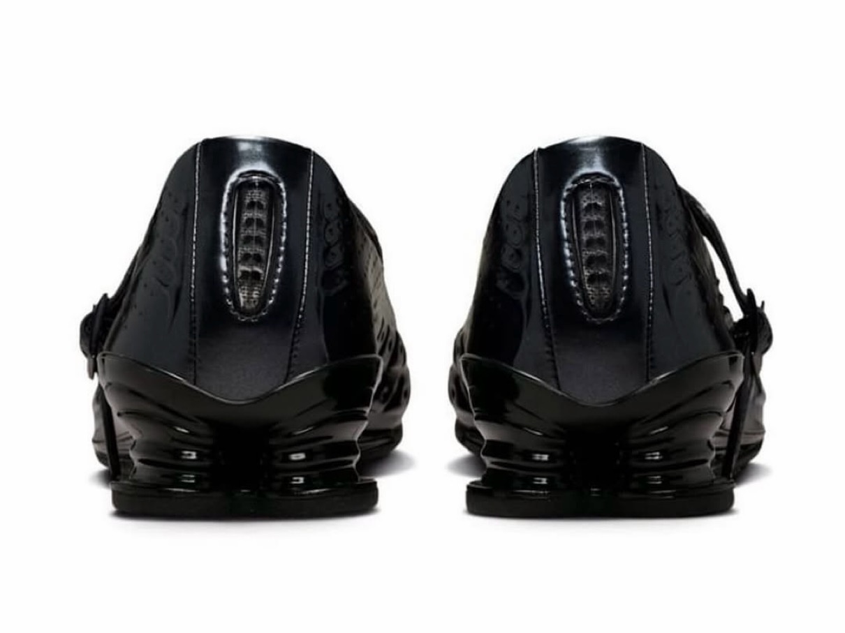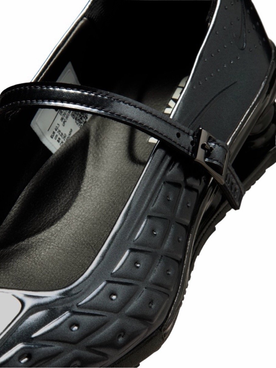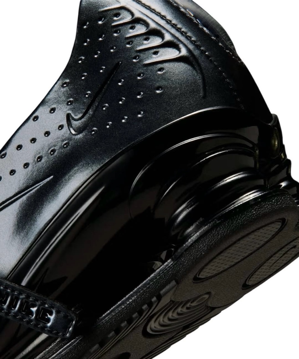 Shox Z Calistraの視覚的インパクトは質感とフォルムに宿る。光沢のあるブラック仕上げのアッパーは、前足部全体に走る成形された折り目が特徴で、硬質で未来的なルックスが注目を集める。側面とかかとには控えめなカットアウトが散りばめられ、滑らかな表面に奥行きと立体感をプラス。最も特徴的なのは、標準的な靴ひもに代わるストラップ式クロージャー。この要素はユニークなフィット感を提供するだけでなく、シルエットのスポーツ起源を和らげ、メリージェーンシューズの様な一足へとアレンジしている。