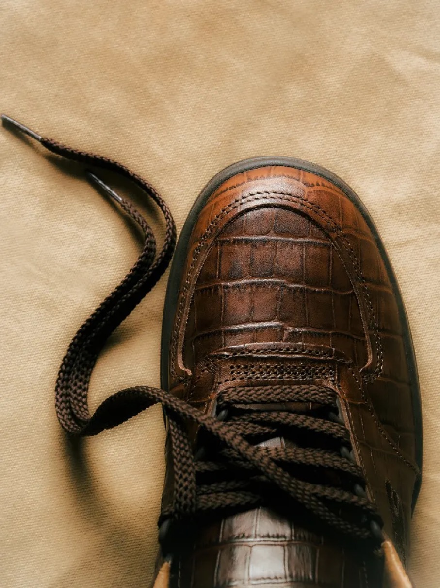 英国製スタイルが誇る卓越した品質で構築された、クロコダイルエンボス加工レザーのアラーデールスニーカーは、シルエットが提供する洗練されたスタイルをさらに際立たせる。フリンビー村を擁する歴史的な地域に因んで名付けられたこのシューズは、英国のレジャーシューズの伝統を基盤とし、ハイキングから着想を得た要素をさらに取り入れている。