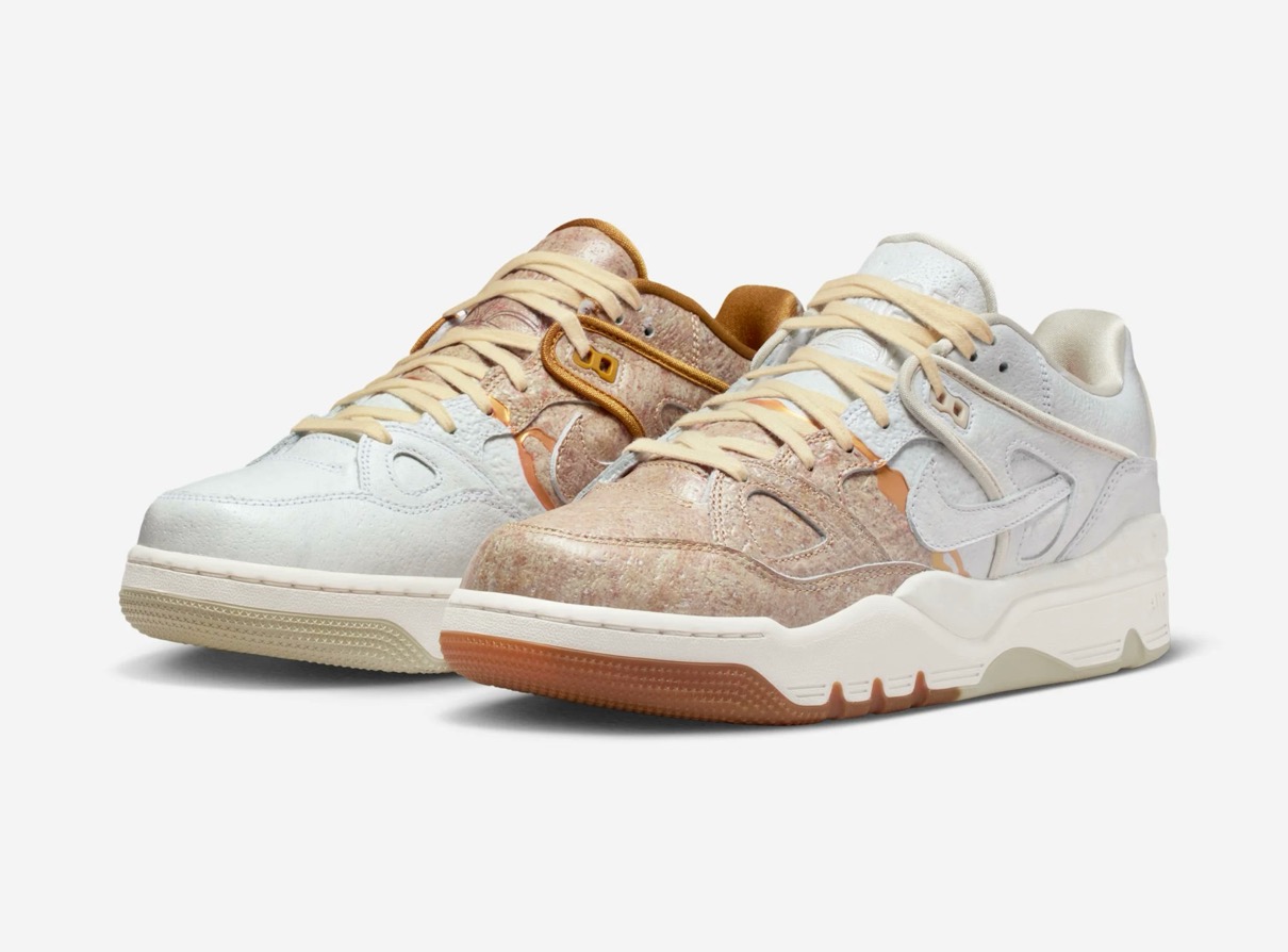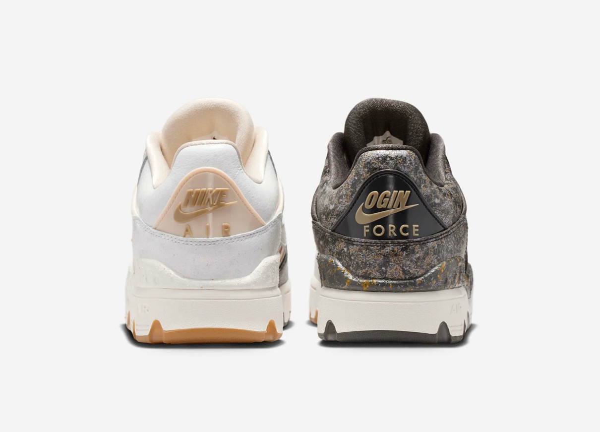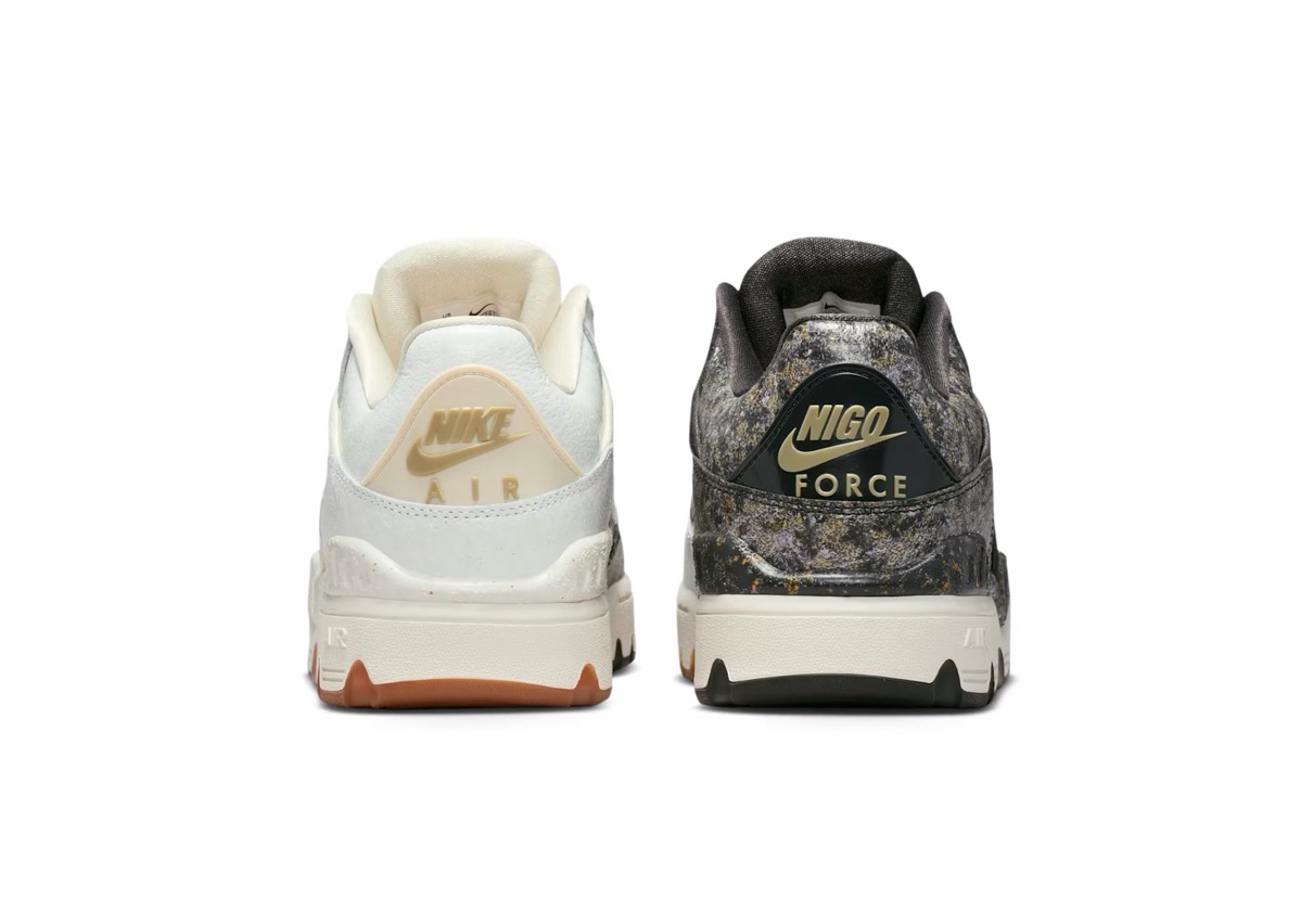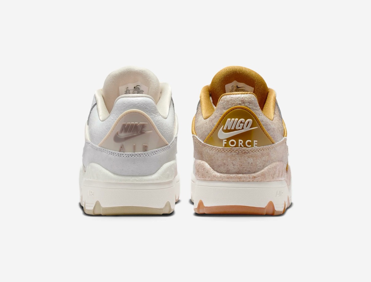 1988年に登場したAir Force 3 Highのローカットver.『Air Force 3 Low(エアフォース3 ロー)』がNIGO®︎コラボモデルとして登場。今回の新作は割れた陶磁器を漆と金粉を使って修復する日本の修復芸術「金継ぎ」に着想を得ており、不完全さの中に美を見出す思想を表現。ヒール下にはアイコニックな NIGO Forceと Nike Air ロゴが刻印されており、特別デザインのワッペンやメタルパーツ、スペシャルデザインのシューズボックスが付属。カラーはファントム/ナイトスタジアム/バンブーと、バンブー/マルチカラー/ミディアムブラウンの2色がラインナップし、テクスチャード加工のレザーで陶磁器の見た目と質感を、デボス加工のゴールドのスプリットで金継ぎの美を再現。さらに、非対称のブロッキングやスプリットカラーのミッドソールで、「壊れたものを修復する」というテーマをシューズ全体で体現した。