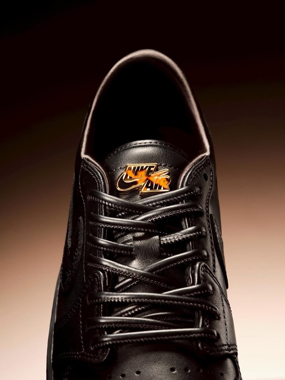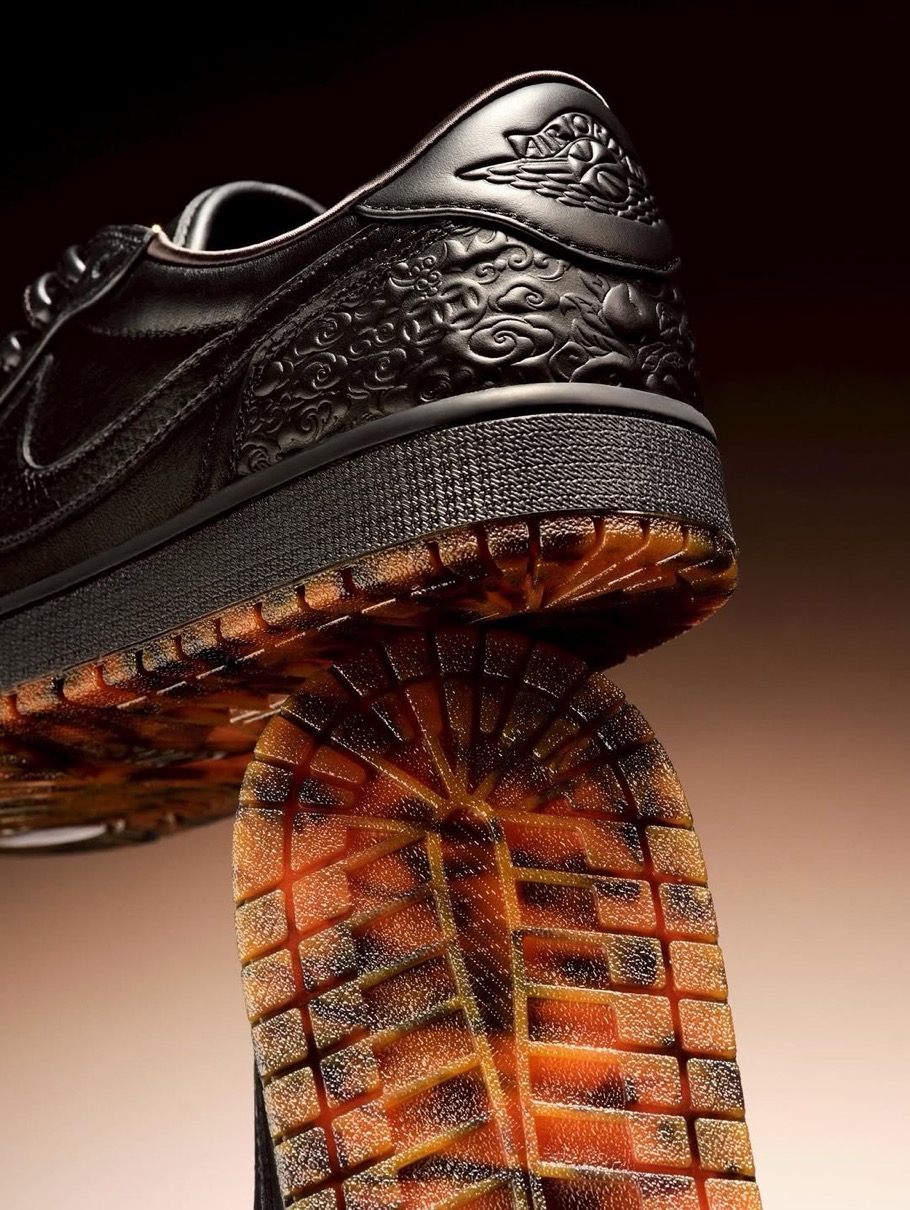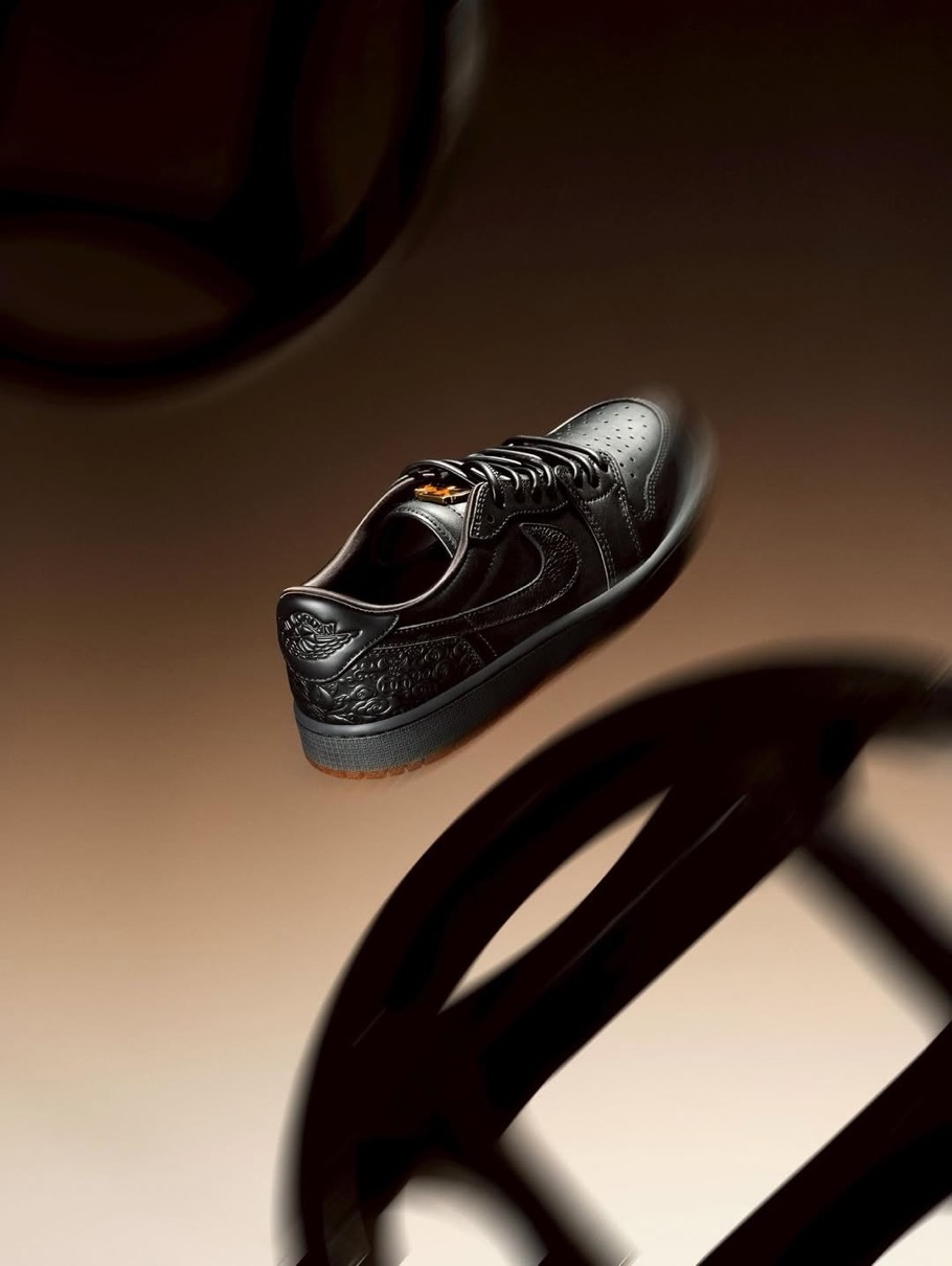 玄武は亀と蛇が合わさったような見た目の霊獣。古代中国において、亀は「長寿と不死」の象徴、蛇は「生殖と繁殖」の象徴で、後漢末の魏伯陽は「周易参同契」で、玄武の亀と蛇の合わさった姿を、「玄武は亀蛇、共に寄り添い、もって牡牝となし、後につがいとなる」と、陰陽が合わさる様子に例えている。今作ではブラックレザーでアッパーを構築し、ヒールカウンターに蛇の模様のエンボス加工や長寿の桃、鶴、吉兆の雲など、中国の伝統的なトーテム要素といった縁起の良いディテールが落とし込まれている。シューズのベースレイヤー、シューレース、シュータン、ライニングには高級なカーフレザーを使用。シュータンのウィングロゴと、シューズボックスに同梱されているスペアシューレースのヘッドはすべて24Kメッキゴールドで作られており、芸術作品のような高級感を醸し出している。