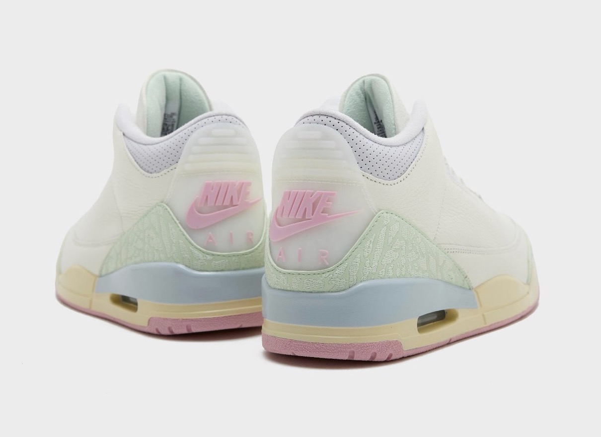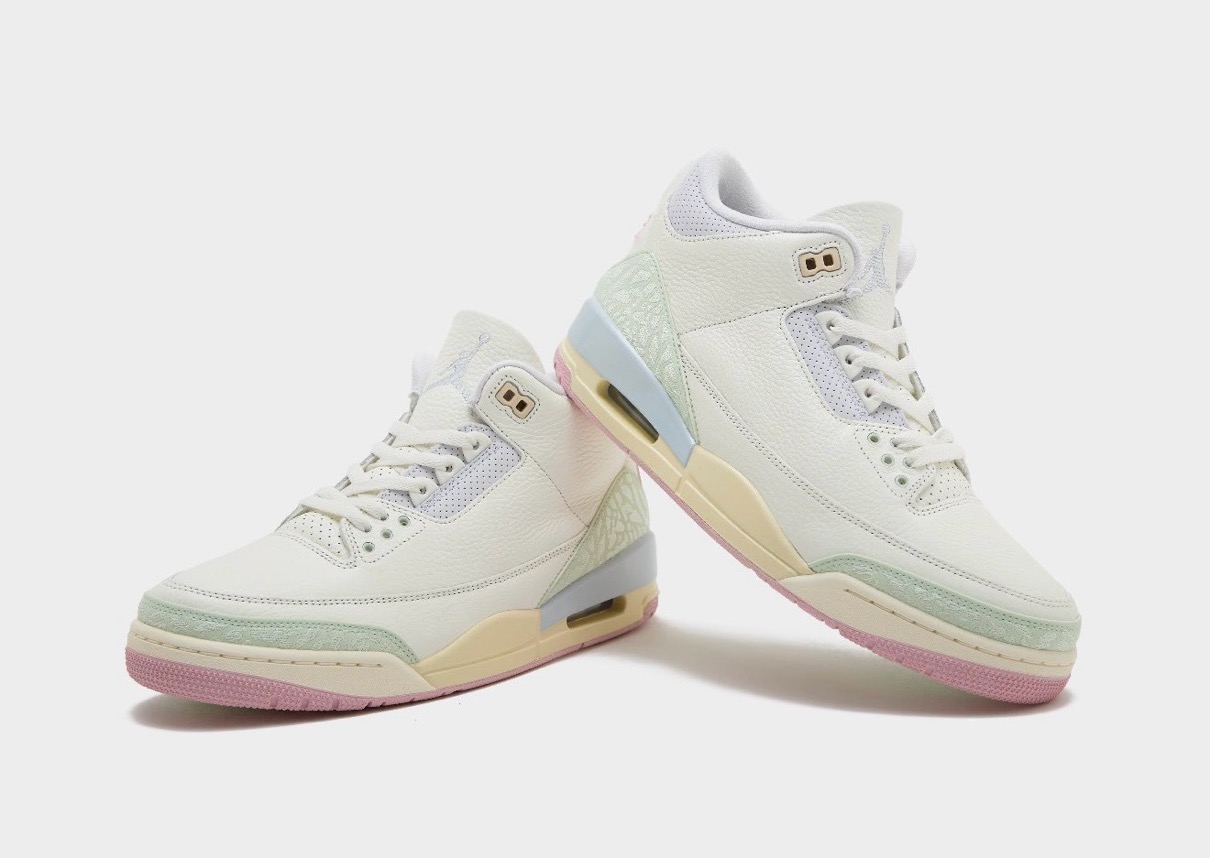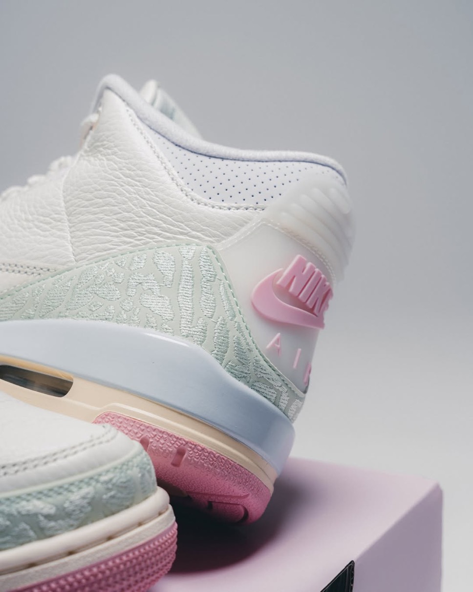 伝説的シューズデザイナー Tinker Hatfield(ティンカー・ハットフィールド)がデザインを手がけ、1988年に初登場したモデル「Air Jordan 3(エアジョーダン3)」。今作ではセイル、ジェイドオーラ、オーラ、アイスドカーミン、モスリン、アイリッシュウィスパーといった春らしいパステルなカラーパレットを採用。ヒールに配されたオリジナル仕様の『Nike Air』ロゴが、クラシックなアイデンティティを表現している。