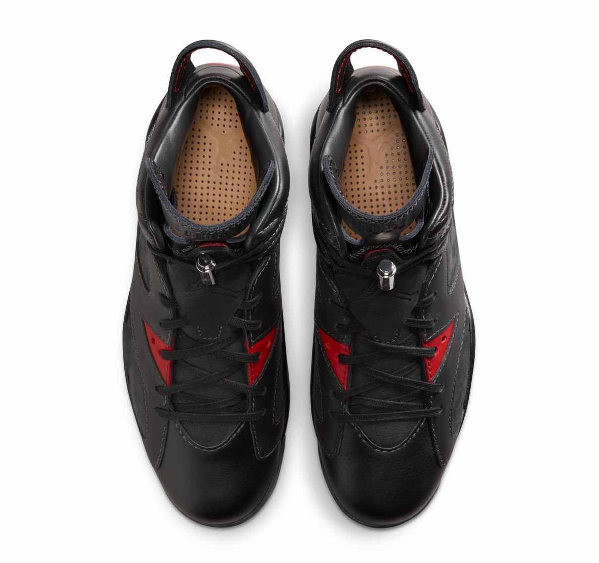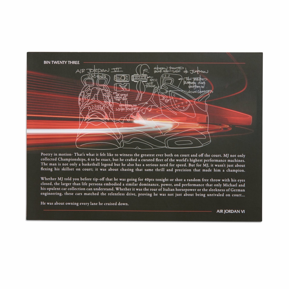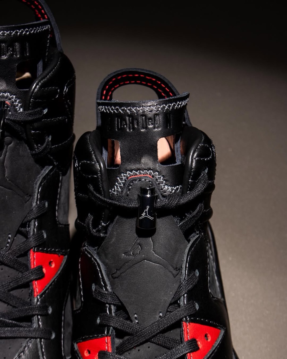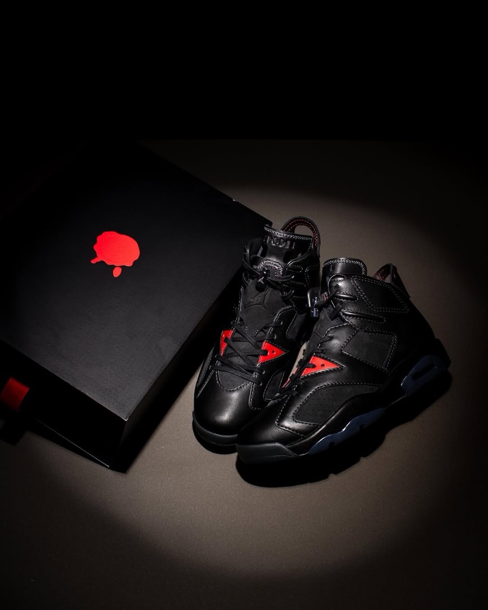 今作でベースに採用されるのは、Michael Jordan(マイケル・ジョーダン)の6代目シグネチャーモデルとして1991年に初登場した「Air Jordan 6(エアジョーダン6)」。アッパーはリッチなブラックレザーを基調とし、鮮やかなレッドのハイライトをプラス。 ヒールにはシグネチャーのワックスシールが施され、最高峰のBin23コレクションの一足であることを示している。さらに、レトロカード、ジャンプマンロゴが刻まれた杉製シューツリー、ダストバッグなど“BIN 23”を象徴するシグネチャー特典も付属する。