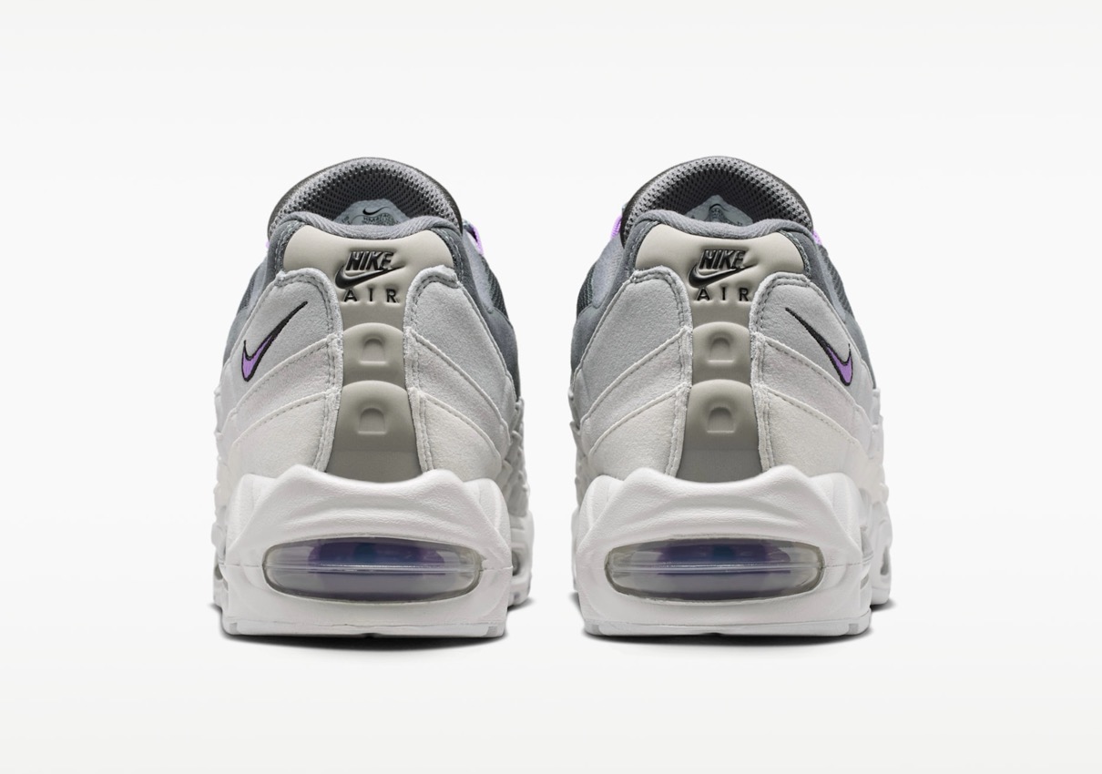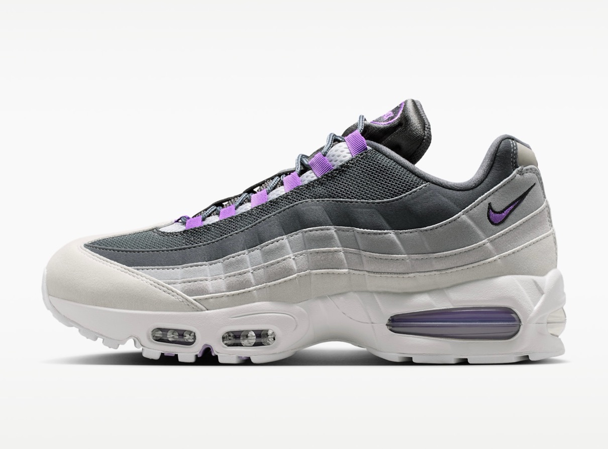 1995年に初めてリリースされ、シューズデザイナーのセルジオ・ロザーノが人体の背骨からインスピレーションを得てデザインしたナイキの人気スニーカー「エアマックス95(Air Max 95)」。同モデルの30周年を記念し、Nike Airユニットとウィンドウが大きい最初期型シルエット 通称“Big Bubble”(ビッグバブル)が2025年に復活を果たした。今回の一足では、ライトグレーのグラデーションパネルでアッパーを構築。随所にブライトバイオレットパープルのアクセントを落とし込んでいる。