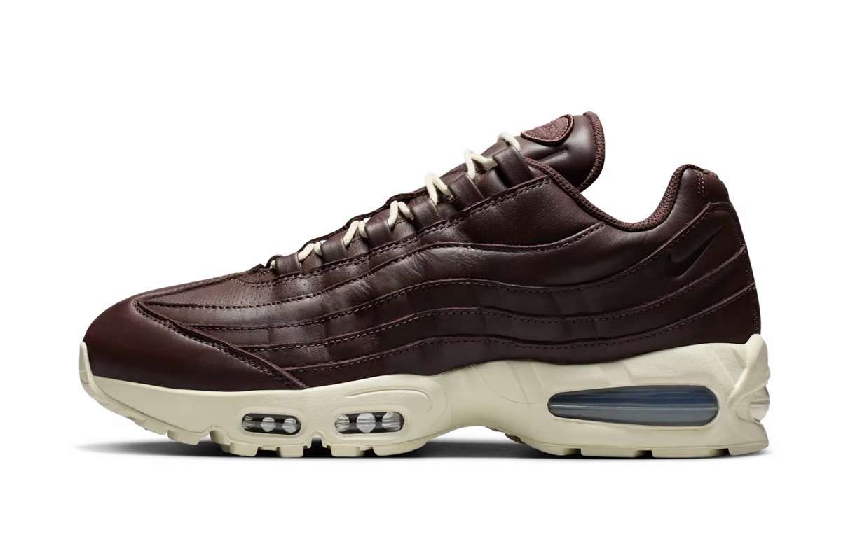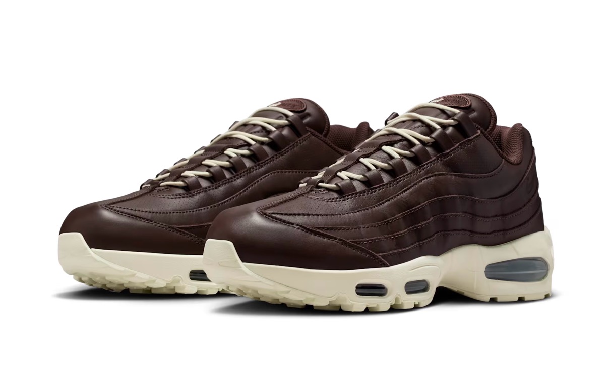 1995年に初めてリリースされ、シューズデザイナーのセルジオ・ロザーノが人体の背骨からインスピレーションを得てデザインしたナイキの人気スニーカー「エアマックス95(Air Max 95)」。同モデルの30周年を記念し、Nike Airユニットとウィンドウが大きい最初期型シルエット 通称“Big Bubble”(ビッグバブル)がAM1に続き復活を果たす。今作ではシュータンやシューレースパイプを含むアッパー細部までをラグジュアリーなレザー素材で構築。ヒールサイドやヒールのスウッシュロゴは型押しで表現し、カラーはバロックブラウンにココナッツミルクのミッドソールといった渋めのカラーで仕上げている。