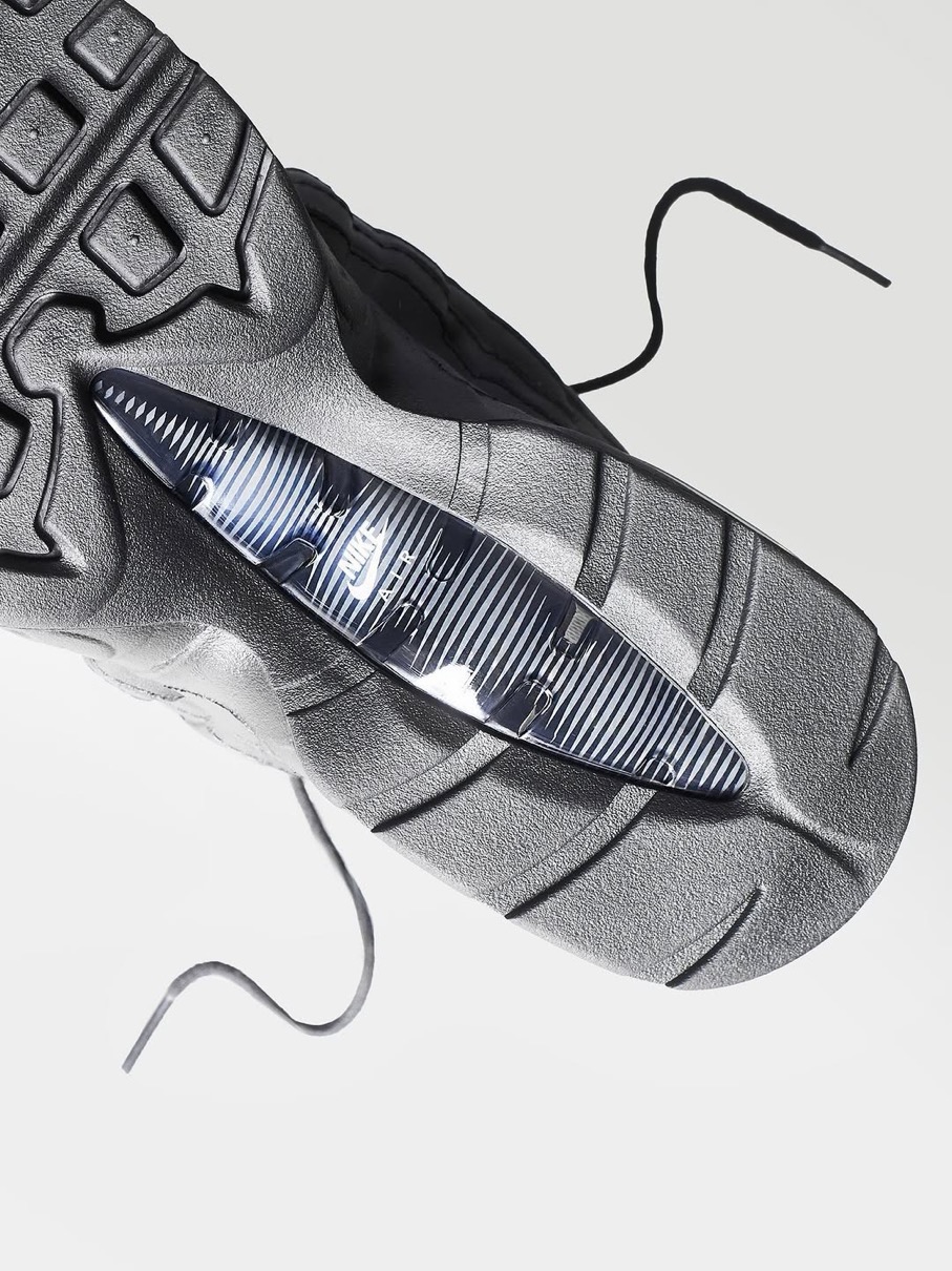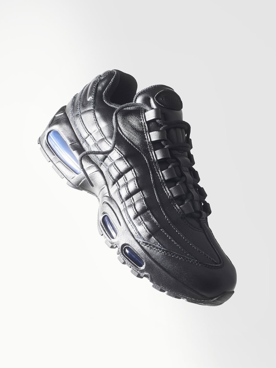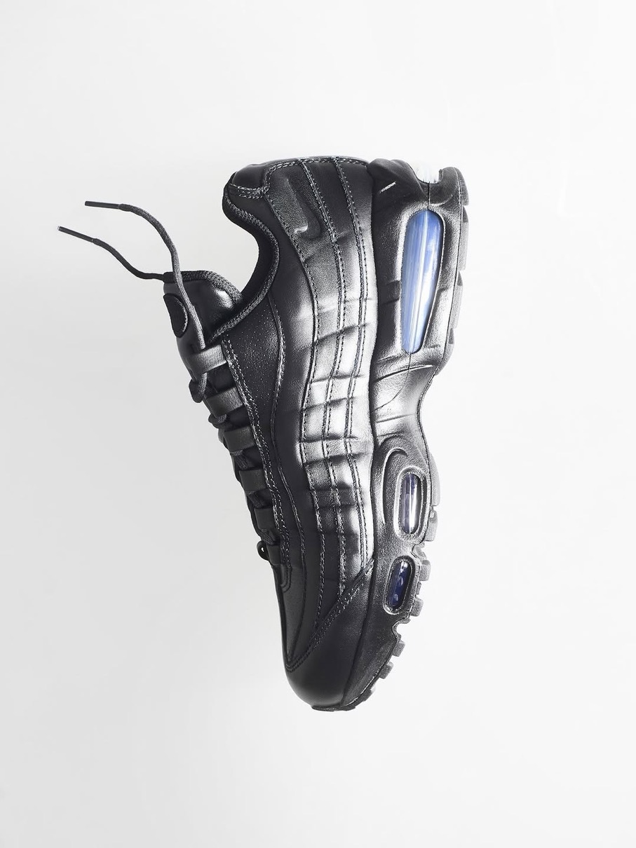 1995年に初めてリリースされ、シューズデザイナーのセルジオ・ロザーノが人体の背骨からインスピレーションを得てデザインしたナイキの人気スニーカー「エアマックス95(Air Max 95)」。同モデルの30周年を記念し、Nike Airユニットとウィンドウが大きい最初期型シルエット 通称“Big Bubble”(ビッグバブル)がAM1に続き復活を果たす。今作ではシュータンやシューレースパイプを含むアッパー細部までをラグジュアリーなレザー素材で構築。ヒールサイドやヒールのスウッシュロゴは型押しで表現し、カラーは無骨なオールブラックで仕上げている。