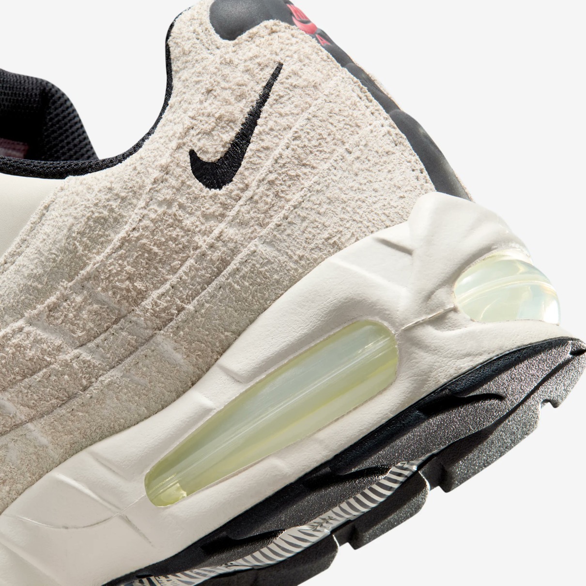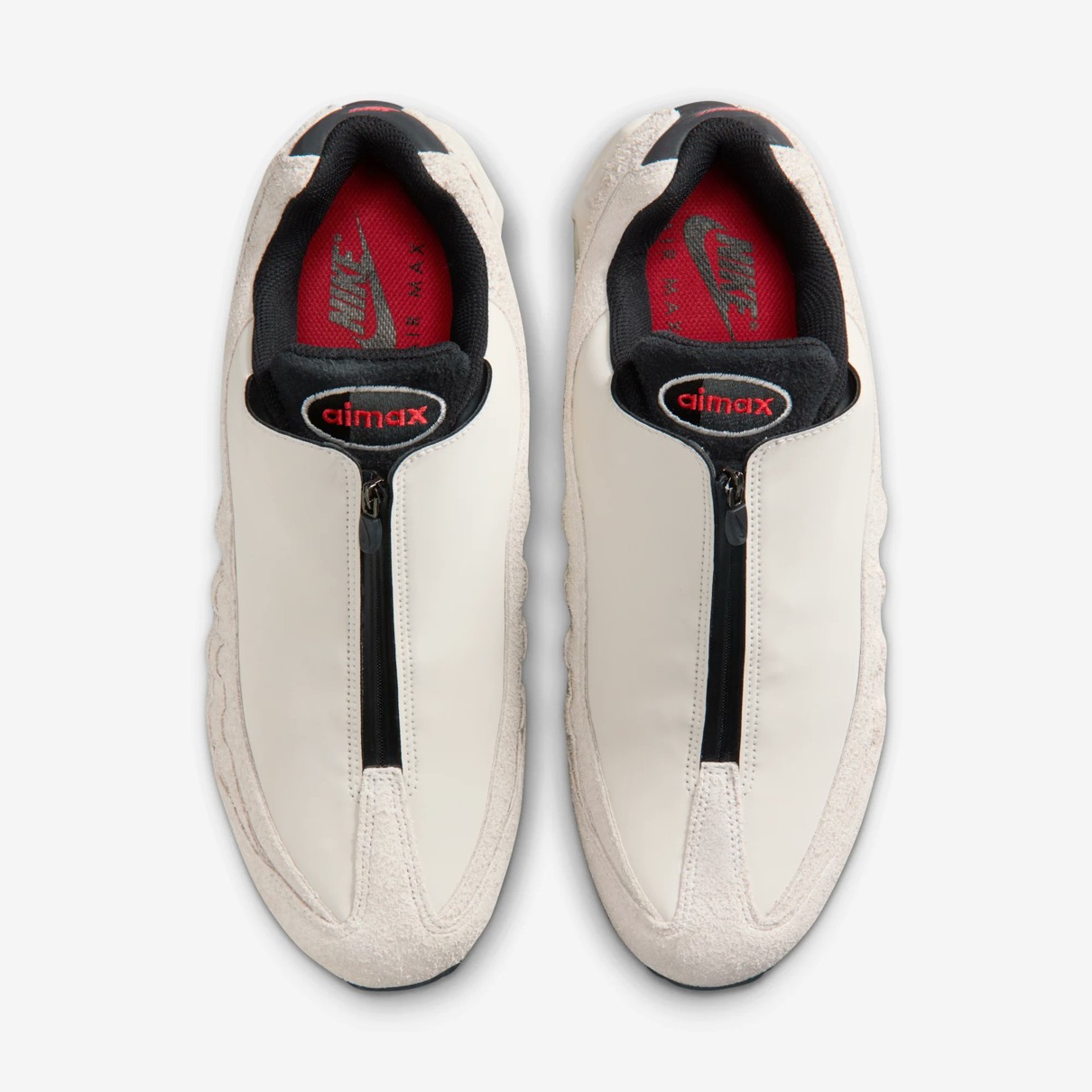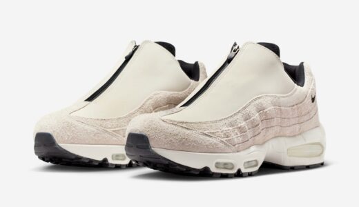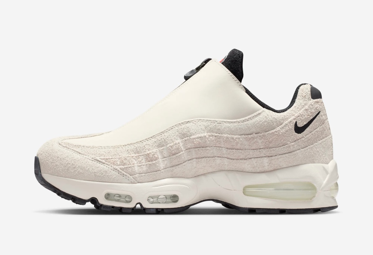 1995年に初めてリリースされ、シューズデザイナーのセルジオ・ロザーノが人体の背骨からインスピレーションを得てデザインしたナイキの人気スニーカー「エアマックス95(Air Max 95)」。同モデルの30周年を記念し、Nike Airユニットとウィンドウが大きい最初期型シルエット 通称“Big Bubble”(ビッグバブル)がAM1に続き復活を果たした。今回登場するのは、2001年に初登場したAir Max 95 Zipの復刻バージョンの新作。スウェードで構築したアッパーのシューレース周りには、フルジップのシュラウドパーツを搭載。カラーはファントムにブラックの組み合わせにライトクリムゾンレッドのアクセントで仕上げている。
