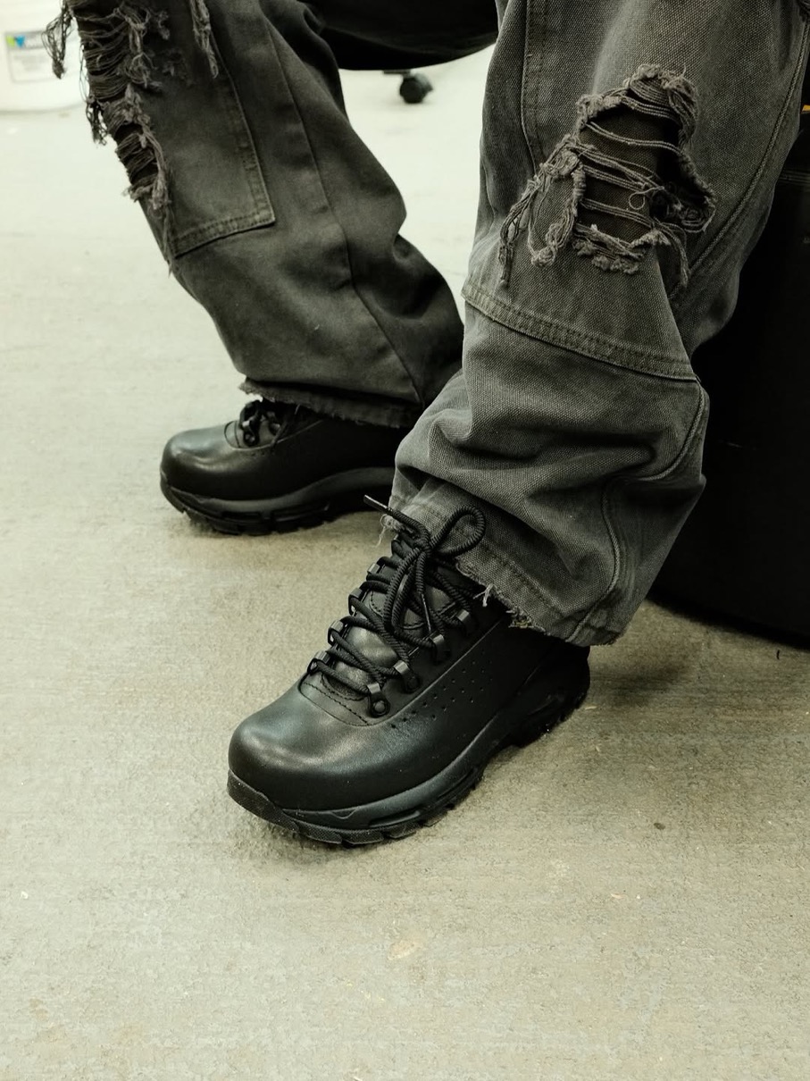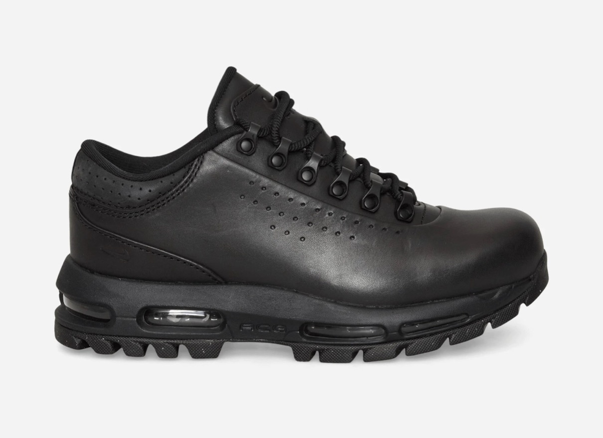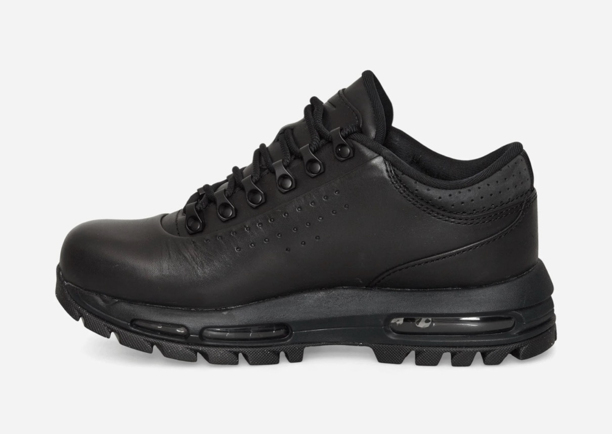 ミッドソールにエアユニットを搭載した本格派マウンテンブーツ「Air Max Goadome(エアマックス ゴアドーム)」をローカットにアレンジ。今作ではアッパーを高級感のあるブラックレザーで構築し、ベンチレーションや小ぶりなアイレットパーツなど、ミニマルなディテールでタウンユースにアップデートしている。