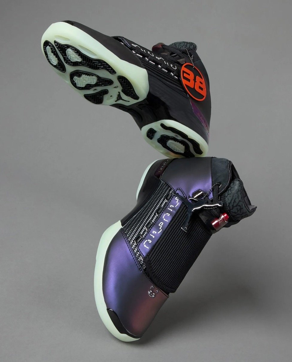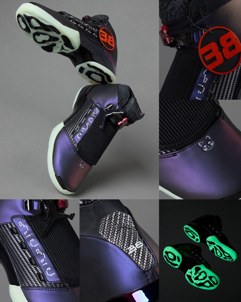 豪華なディテールには、高級車の内装を彷彿とさせるスエード製履き口、カスタムラッピングを思わせる色変化するパープルアッパー、そして加熱された排気管に例えた暗闇で光るソールが含まれる。さらに、つま先部分には猫への愛を表現したグラフィックをさりげなく配置。この力強いスニーカーは、不屈の精神、感謝の気持ち、そして前進へのオマージュとなっている。