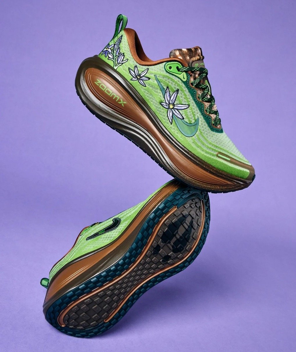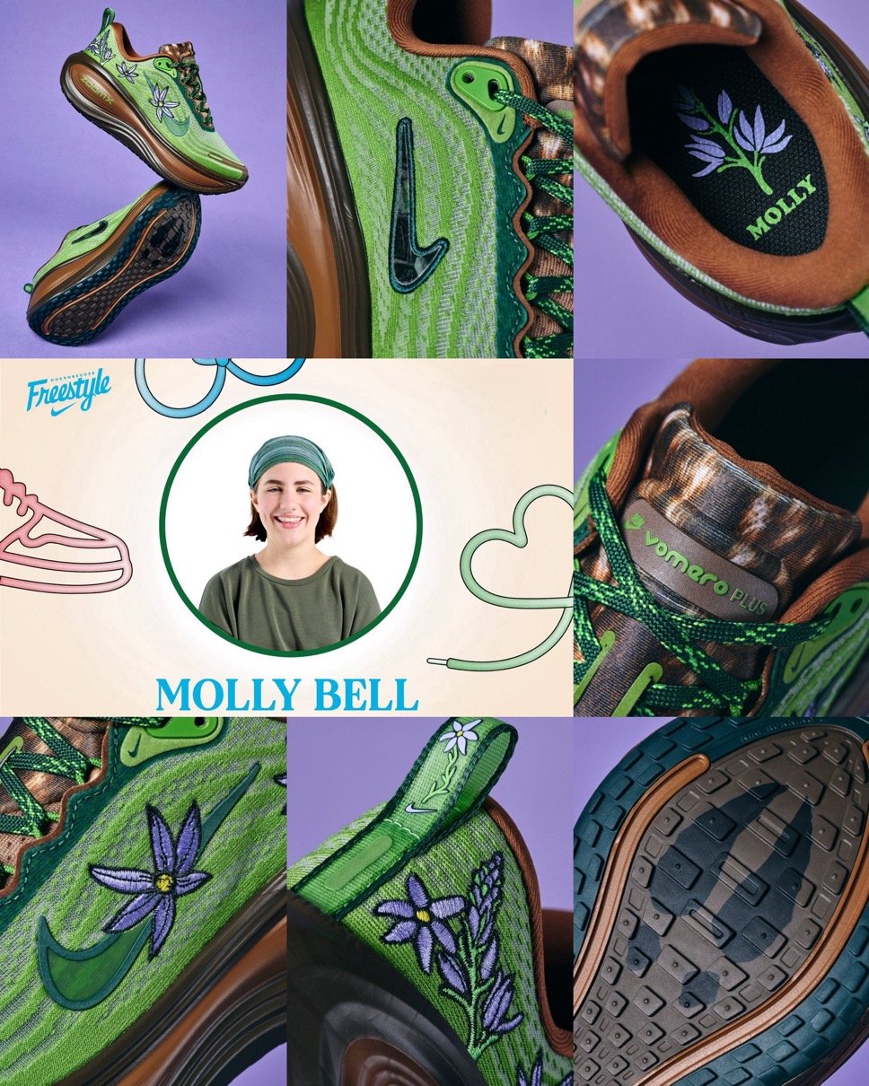 自然界と放浪への憧れに着想を得たナイキ ヴォメロ プラス “モリー・ベル”は、オレゴン州の風景への愛のメッセージ。フィールド生物学者を目指すティーンエイジャー、モリー・ベルは自身のデザインに太平洋岸北西部の動植物のイメージを反映。ヴォメロのアッパーにはオレゴン原産のカマス花(カマスバナ)の開花模様が散りばめられている。反射性レンズ加工を施した森のプリントスウッシュと、土をモチーフにしたアウトソールには子鹿の蹄のグラフィックが配され、モリーが大自然の中で過ごした時間を表現。自閉症コミュニティの積極的な支援者であるモリーとその家族にとって重要な意味を持つ、作家であり植物学者でもあるロビン・ウォール・キマーラーの言葉が刻まれている。「私たち一人ひとりが知るべき最も大切なことは、自らの唯一無二の才能と、それをこの世界でどう活かすかである」という彼女の言葉は、モリーのフィールドジャーナルに記されていた。ヴォメロプラス “モリー・ベル”のフローラル刺繍とアニマルプリント、そしてアースグリーンとソフトピンクの配色は、自然界への畏敬の念と自己表現へのこだわりを強調している。