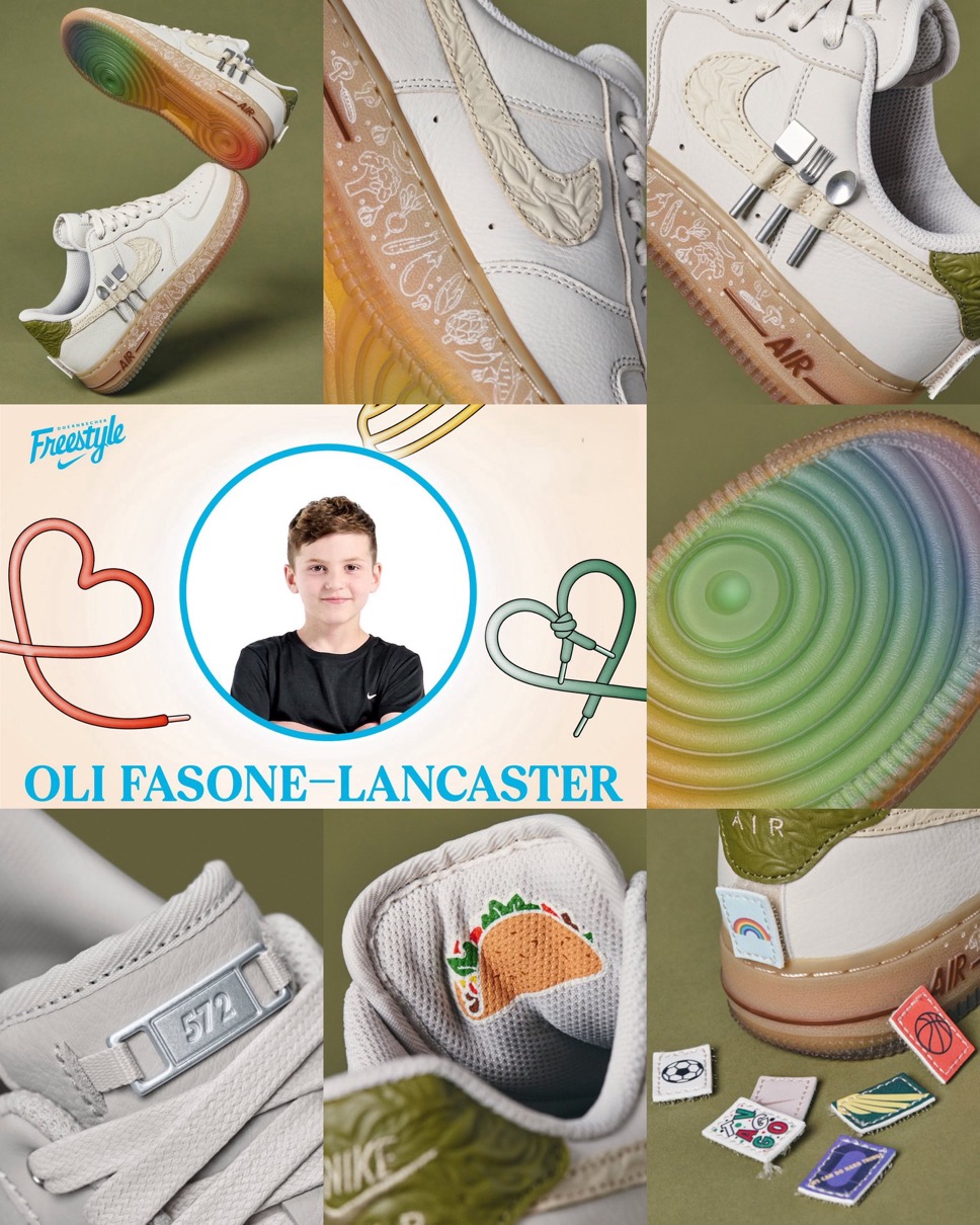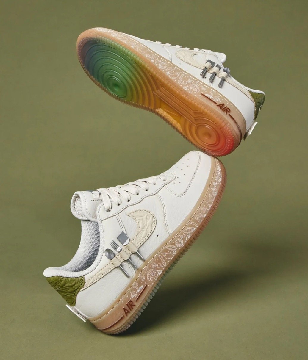ナイキ エアフォース1 “オリ”は、創造性と勇気、そして美食へのインスピレーションに満ちあふれている。オリは将来シェフを志す青年で、がん治療のため夢を一時中断せざるを得なかったが、その前から料理への情熱を持っていた。今作は、彼の料理への関心と勇気を象徴し称えるために手作業で制作された特別な一足だ。スウッシュにはオリーブの枝が、インソールには野菜畑が、デザインには小さな調理器具が散りばめられている。