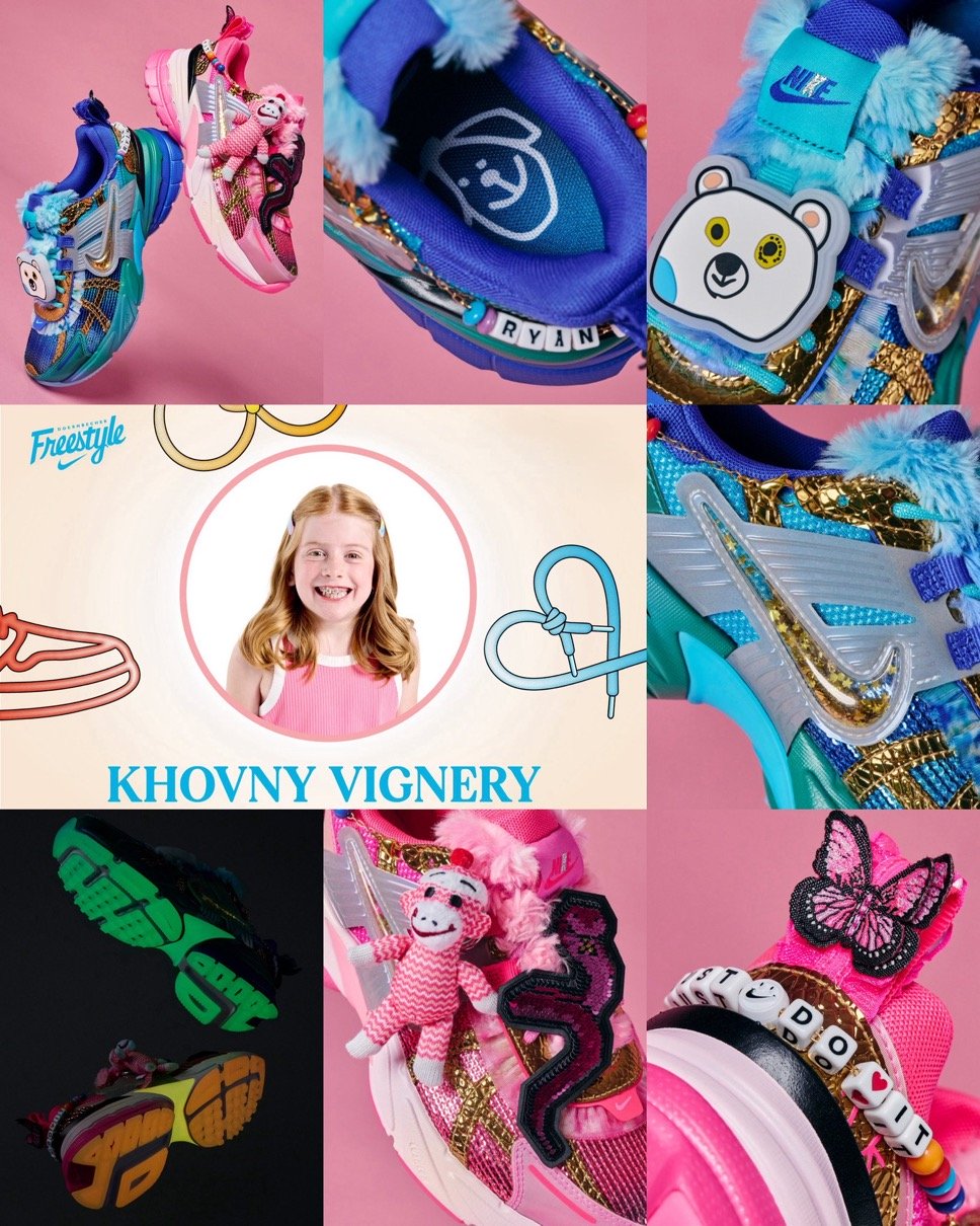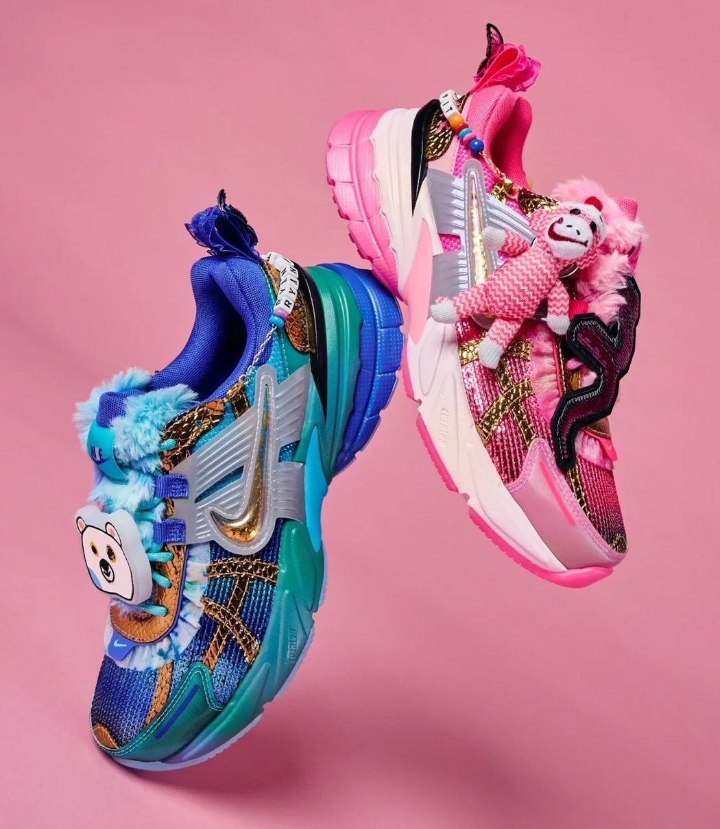 ナイキ V2K ラン “コヴニー”は、ある若きデザイナーの想像力と勇気を称えるモデルだ。その名は、幼い彼女を救った医師ステファニーとドミトリー・ドゥホヴニー夫妻へのオマージュである。ファーストネームが「スノー」のように発音されるコヴニーは、遊び心あふれるディテールで靴を埋め尽くし、創造性を表現した。光るクマ、愛玩モンキー「ピンキー・ドゥードゥー」のミニチュア版、夢のペットであるヘビのチャームがデザインに登場している。