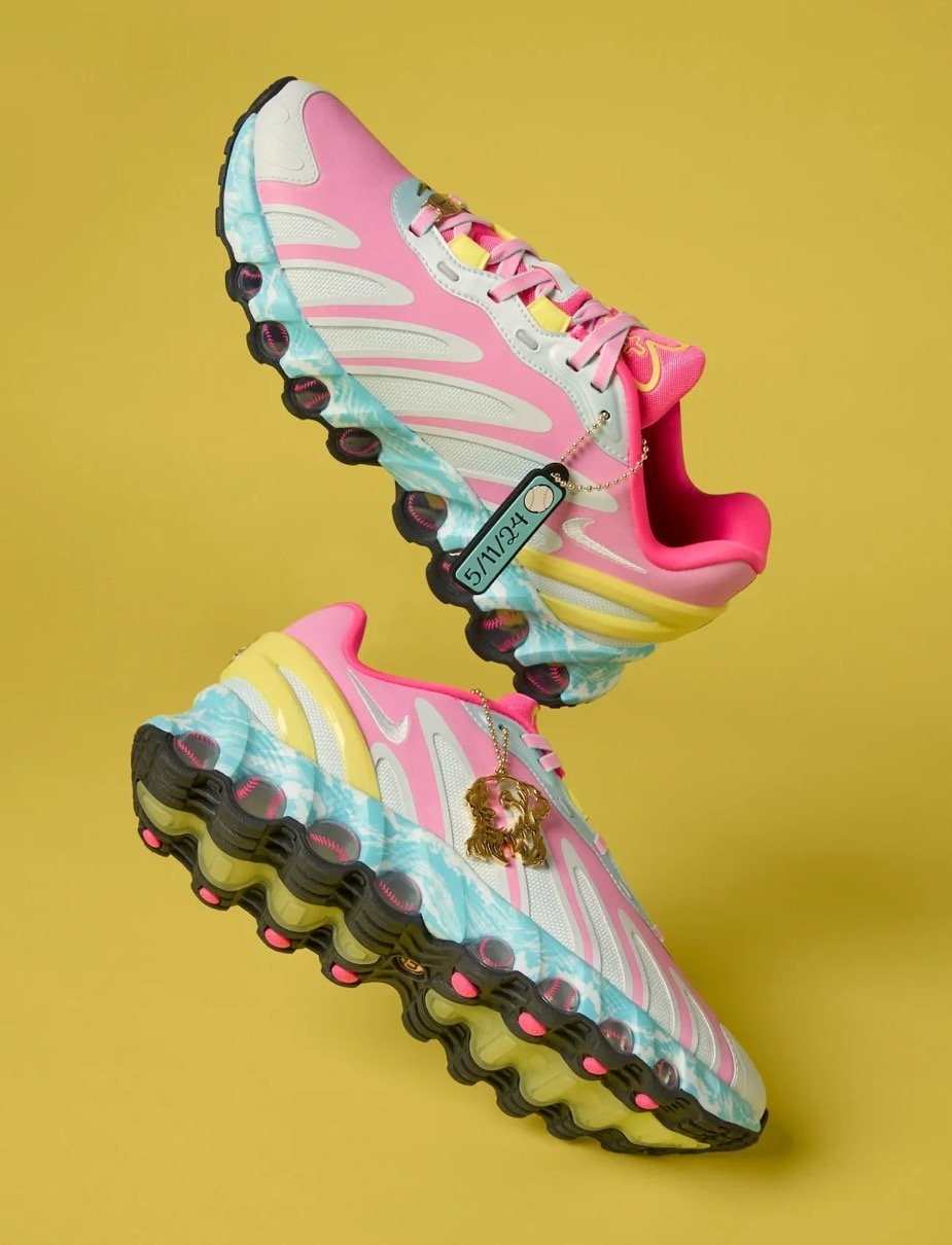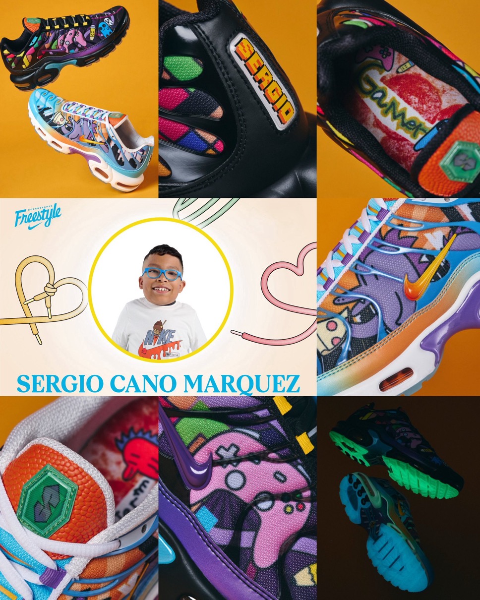 両スニーカーのディテールも同様に遊び心にあふれ、バスケットボールのテクスチャーを施したタン、ピクセル化された「Sergio」ヒールロゴ、暗闇で光るミスマッチなアウトソールなど、セルジオのエネルギーを表現した遊び心あふれるデザインだ。ソックライナーにもモチーフが施されている——ピザである。これはスーパーヒーローの大好物へのオマージュだ。前向きな精神と希少な遺伝性疾患を抱えながら、セルジオは誰もが持つ唯一無二の存在を称えるため、自らエアマックスプラスをデザインした。彼のカラフルな作品は、違うことがただ許容されるだけでなく、超クールであることを示している。